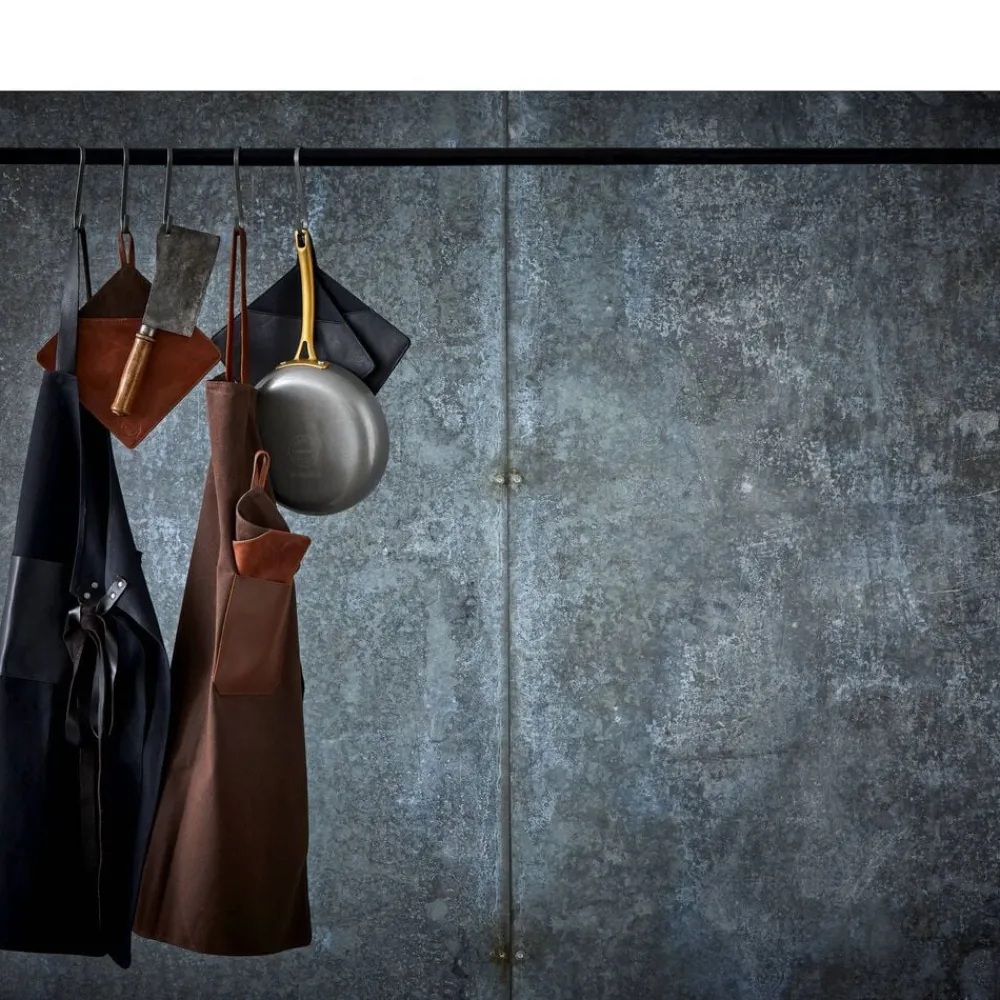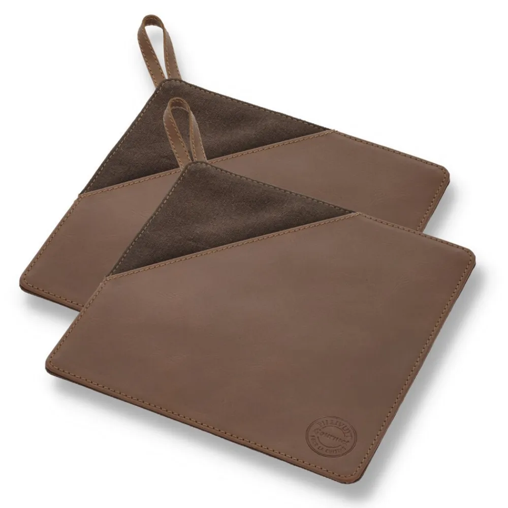 2 brune grydelapper af kanvas og læder. Kanvas er 100 % bomuldsstof i en kraftig vævning. Det er slidstærkt og vandafvisende, hvilket gør det egnet til hverdagsbrug. Læderet er 100 % bøffellæder. Bøffellæder er slidstærkt og har stor elasticitet. Med passende pleje vil bøffellæder holde i lang tid og få patina, som fremhæver læderets skønhed. Grydelapperne har en lomme, der gør det nemt at gribe fat i fade m.m. De beskytter hele hånden, fx når du tager et varmt fad ud af ovnen.