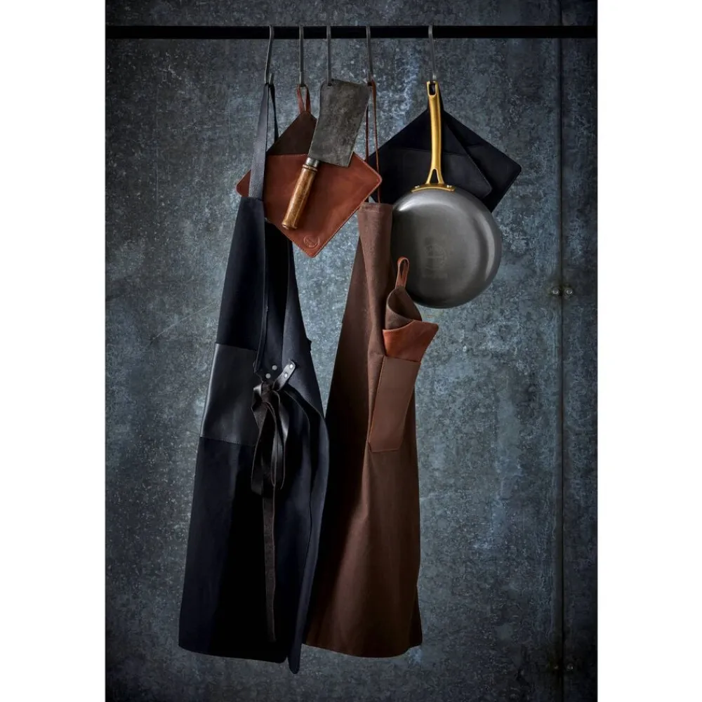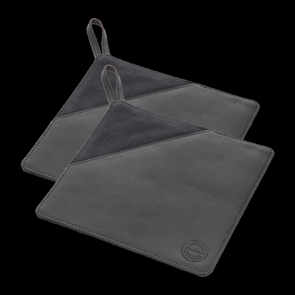 2 sorte grydelapper af kanvas og læder. Kanvas er 100 % bomuldsstof i en kraftig vævning. Det er slidstærkt og vandafvisende, hvilket gør det egnet til hverdagsbrug. Læderet er 100 % bøffellæder. Bøffellæder er slidstærkt og har stor elasticitet. Med passende pleje vil bøffellæder holde i lang tid og få patina, som fremhæver læderets skønhed. Grydelapperne har en lomme, der gør det nemt at gribe fat i fade m.m. De beskytter hele hånden, fx når du tager et varmt fad ud af ovnen.