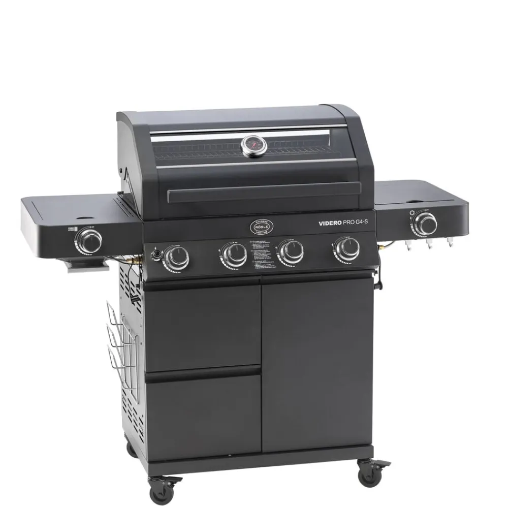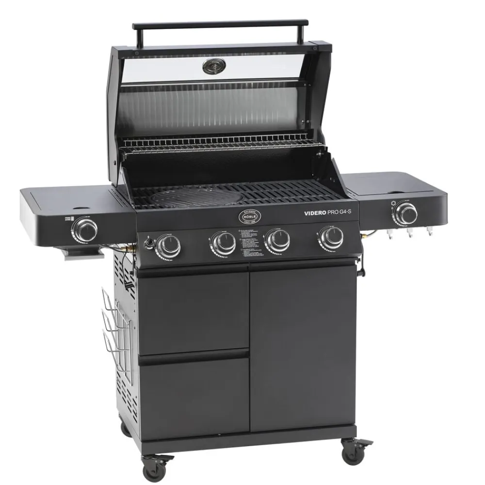 Rösle Videro Pro G4-S gasgrill i mat sort med mange funktioner. Gasgrill med 4 hovedbrændere lavet af rustfrit stål (hver 3,5 kW). Hovedgrillområde: 70 × 45 cm. Opvarmningsstativ: 70 × 16 cm. Kraftigt grillgitter af emaljeret støbejern giver de klassiske grillstriber. Det unikke og fleksible VARIO+ grillsystem giver mange anvendelsesmuligheder: Grillen indeholder tre riste, hvoraf den runde kan fjernes og erstattes af en pizzasten (23937), en grillplade (24145), en gryde (24404) eller en wok (24143), som kommer tæt på varmekilden og derved kan opnå høj varme. Den smarte holder gør det nemt at opbevare pizzasten og grillplade. 20500 watt. 30 mbar.