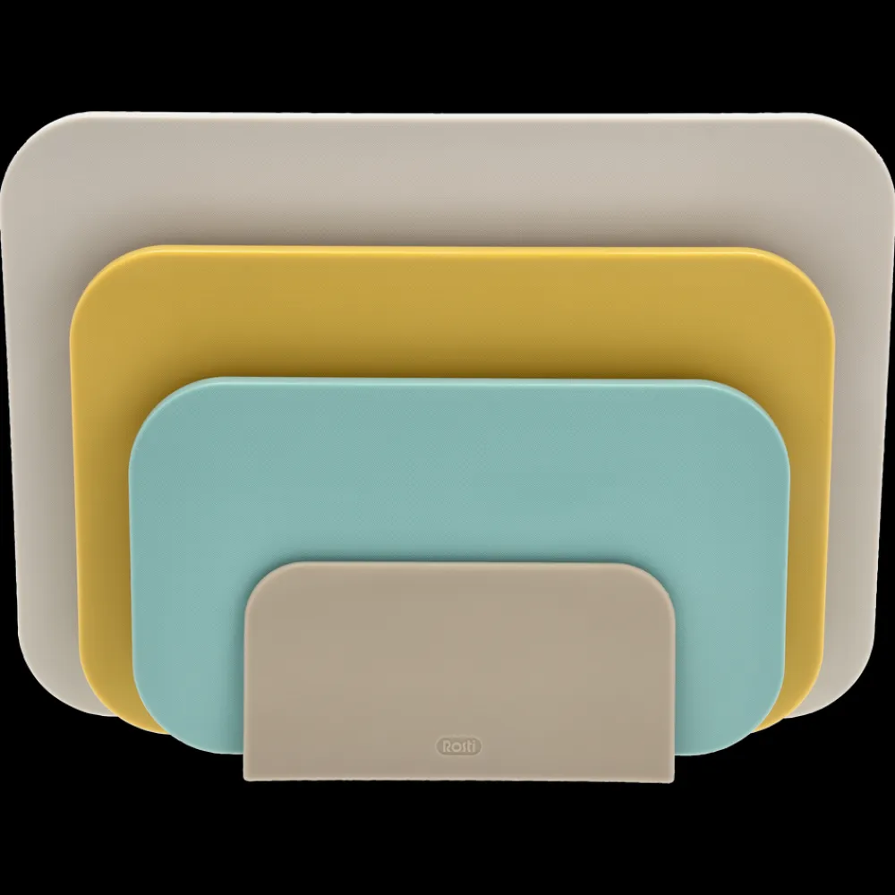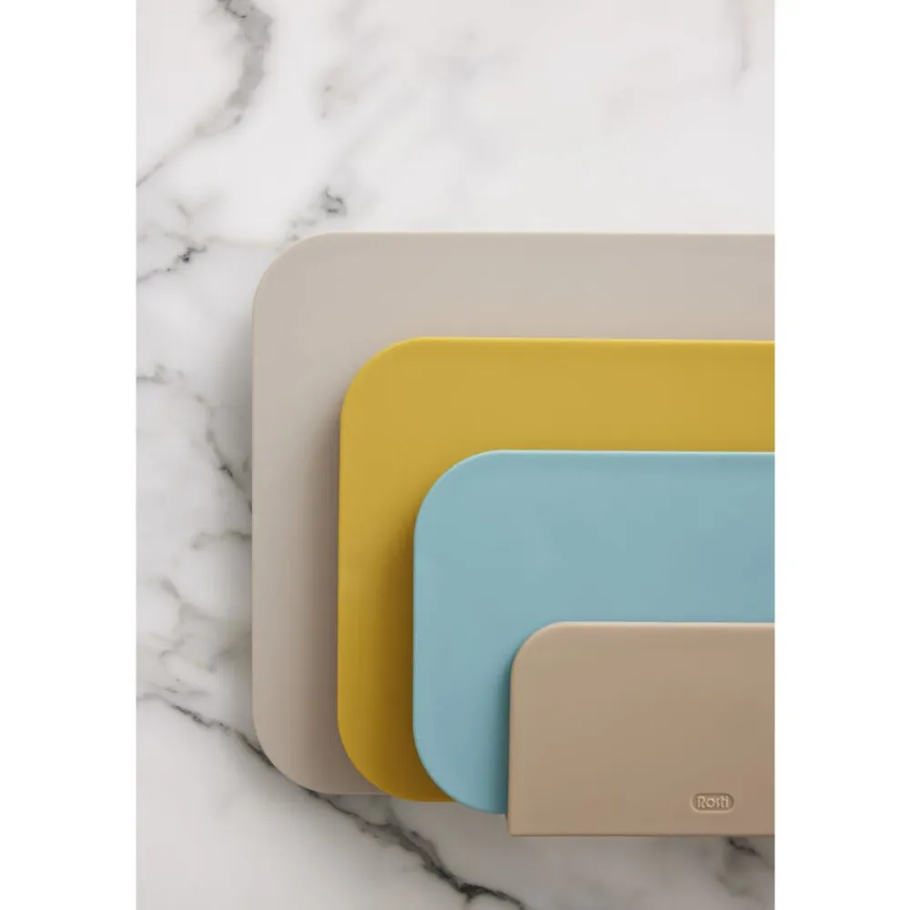 De tre størrelser er samme tykkelse og kan sagtens anvendes til servering og tages med ind på bordet til brød, pølse, oste og tapasanretninger med mere. Derfor er seriens fine farver valgt med grundig omtanke, og med sine venlige former bliver sættet et dekorativt supplement til din køkkenindretning.
