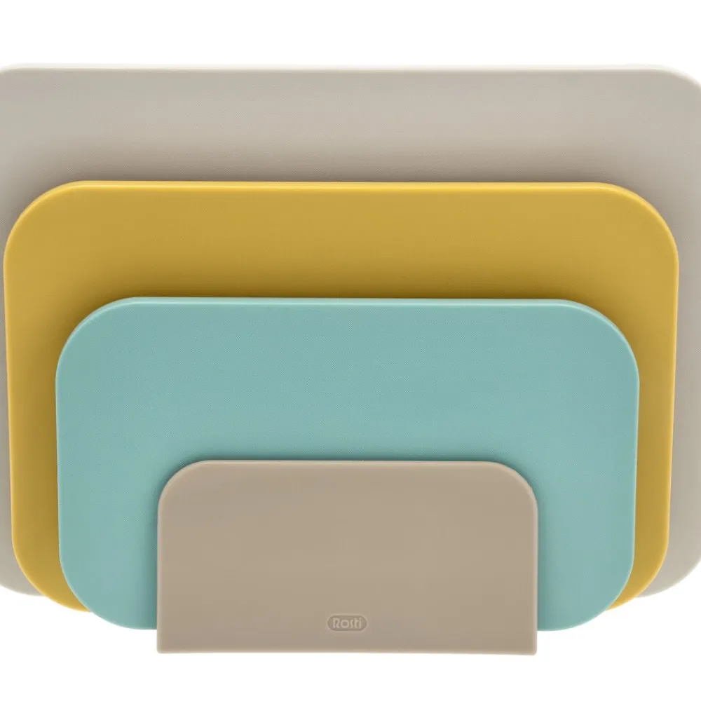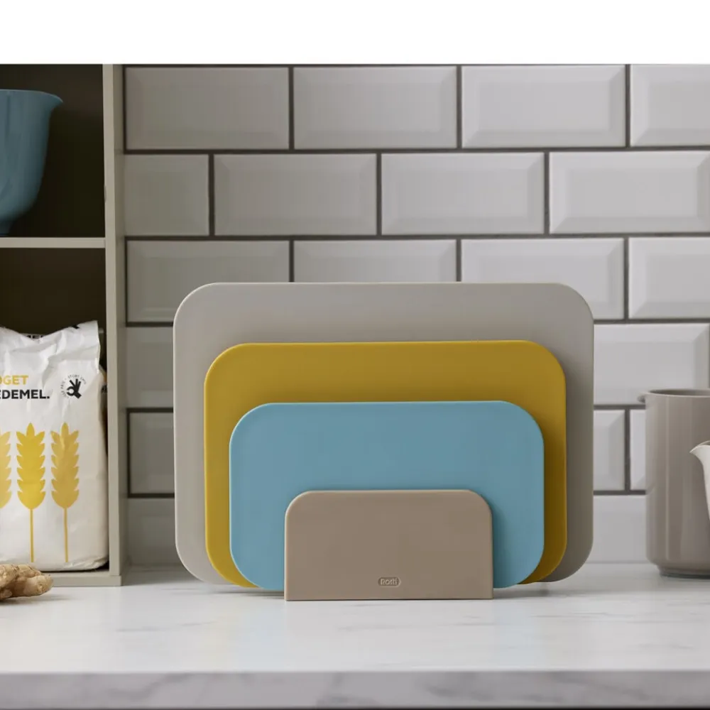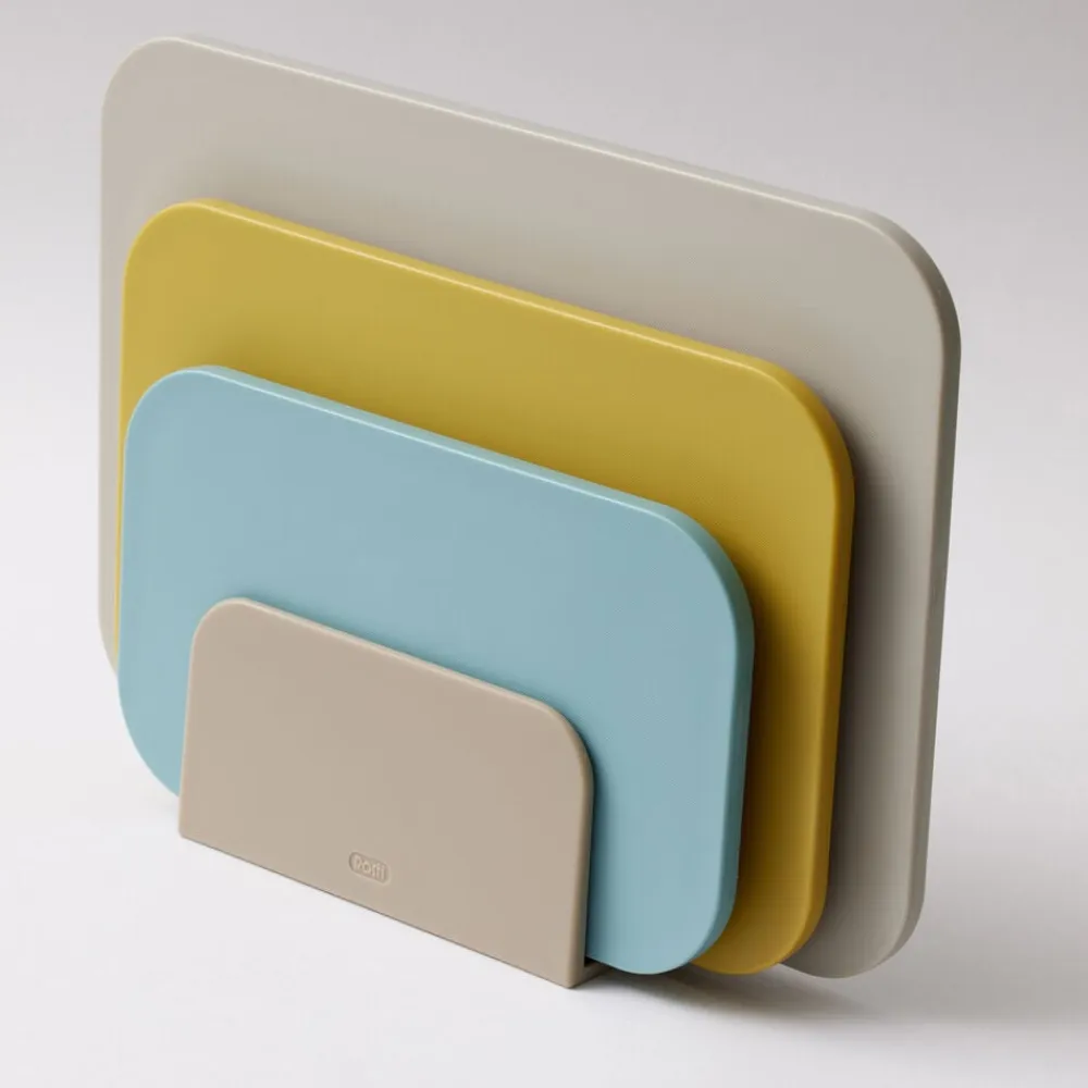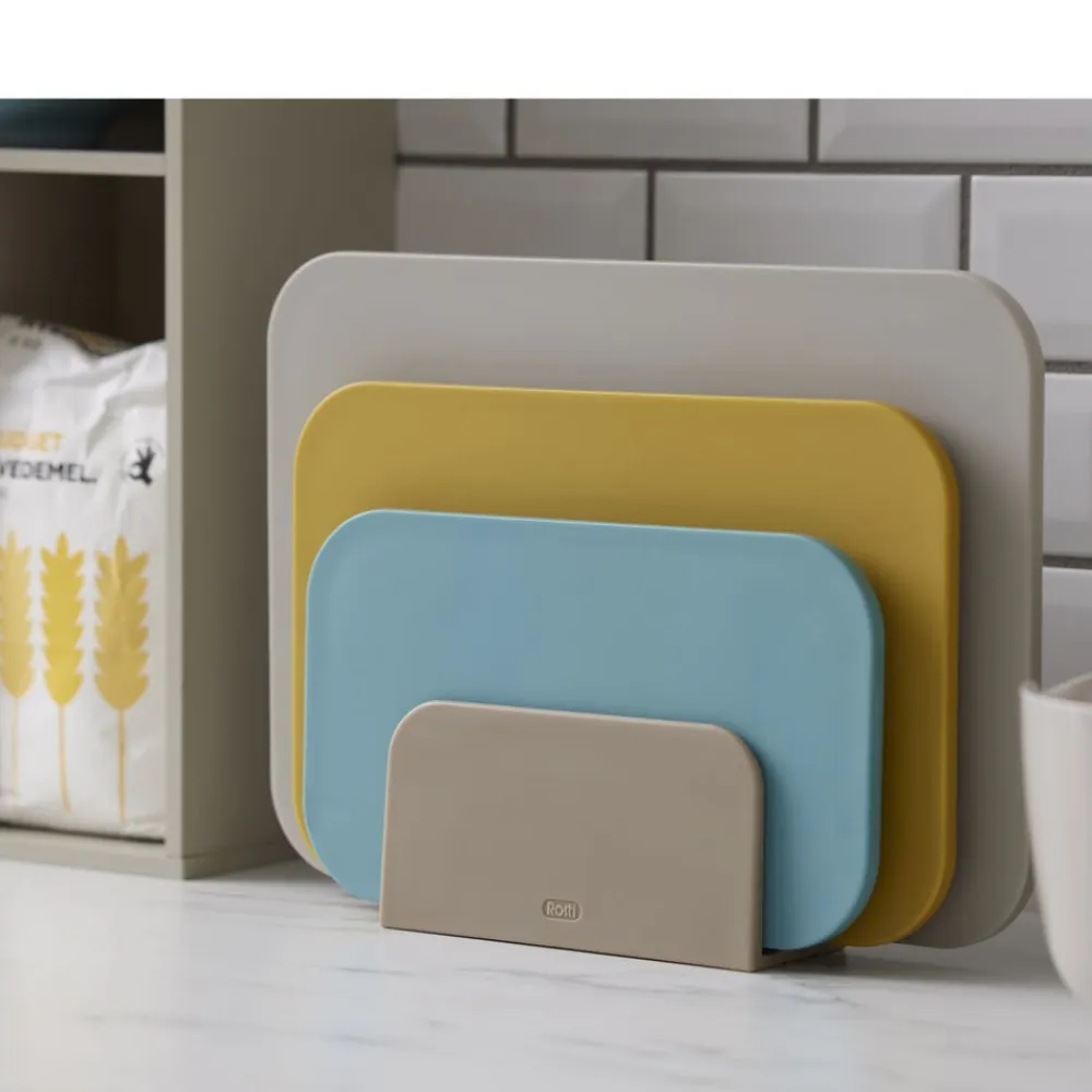 Sættet kommer med en smart holder med fokus på både opbevaring og hygiejne. Den holder skærebrætterne samlet, uden at de optager meget plads på køkkenbordet, og er udformet, så du kan sætte et fugtigt skærebræt direkte i holderen. Skærebrætterne står nemlig med lidt afstand til hinanden, og i bunden af holderen er der riller, som sikrer god ventilation og dermed hygiejne, f.eks. hvis brættet stadig er fugtigt, når det sættes på plads. Brætterne kan vaskes i opvaskemaskine.