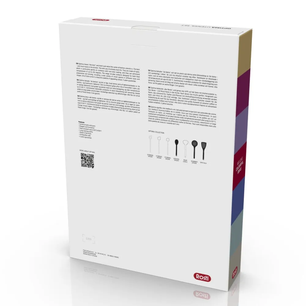 Optima betyder “de bedste”, og det er lige, hvad denne serie af køkkenredskaber er. De bedste – og musthaves i køkkenet. Dem du intuitivt griber efter. De er fremstillet i nylon, der er særligt skånsomt mod gryder og pander med non-stick-belægning, og tåler temperaturer op til 220 °C. Sortimentet indeholder produkter til såvel tilberedning som servering, blandt andet en lang række smarte skeer i forskellige størrelser og udformninger. Alle fås i en smuk palet af flotte farver. 5 års garanti.