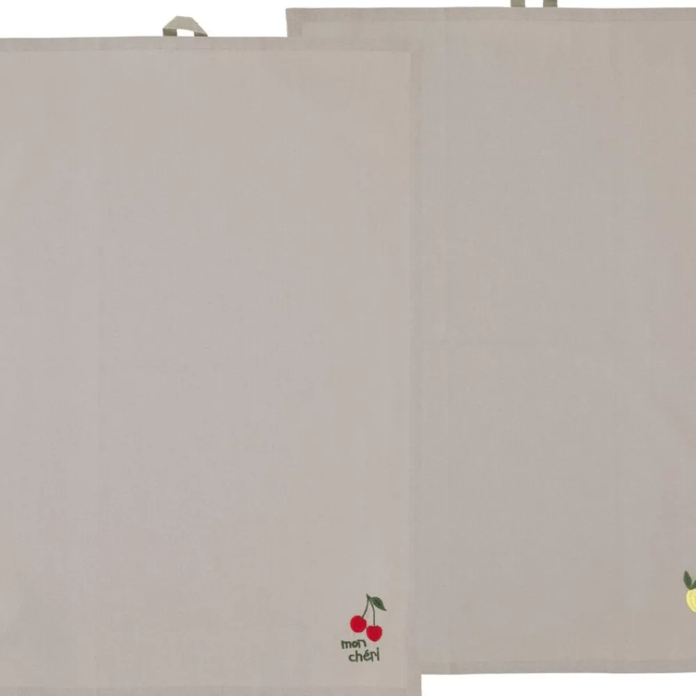 Hvert viskestykke er prydet med charmerende motiver af kirsebær, citroner, kaffekopper og croissanter.