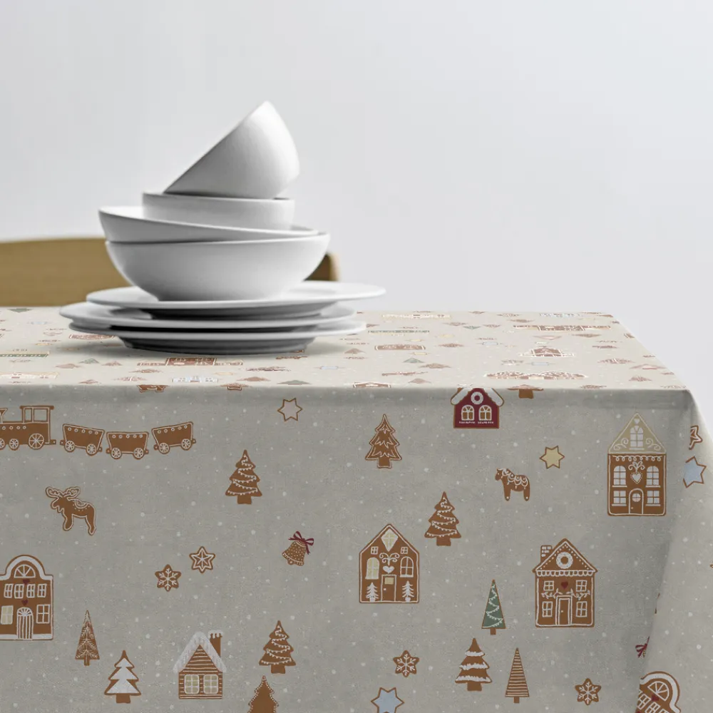 Skab en magisk julestemning med Södahls Gingerbread akryldug. Det eventyrlige design i farven nature byder på charmerende motiver med små huse, rensdyr, juletræer og tog, der vækker minder om hyggelige juledage. Den smudsafvisende akrylbelægning gør dugen både praktisk og let at rengøre – perfekt til julefrokoster og familietid omkring bordet.