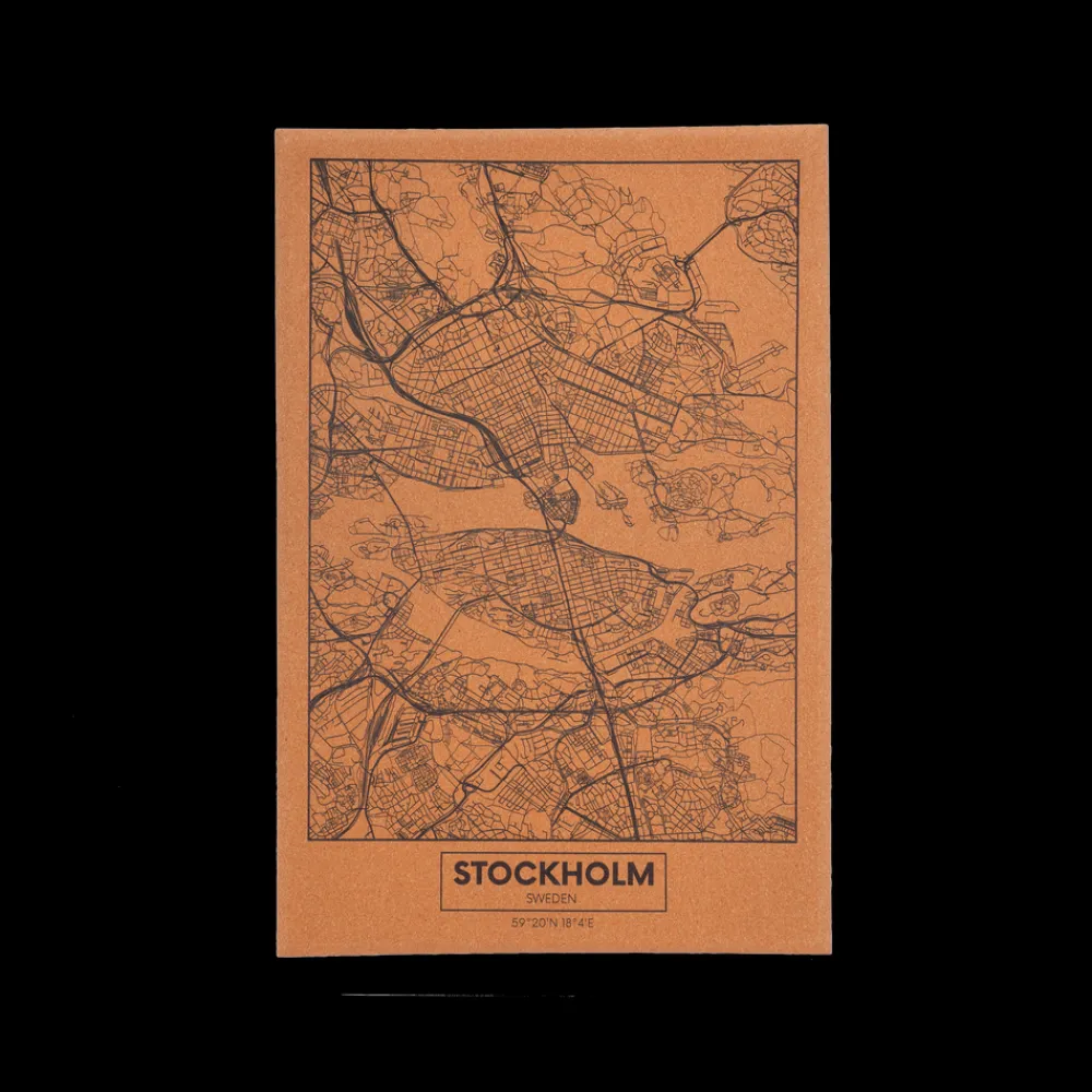 Bykort med Stockholms vejnet på korkplade uden ramme.