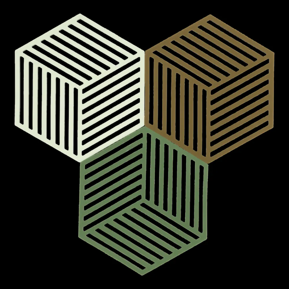 Serien er skabt af designertrioen VE2. Hexagon fås i mange spændende farver og er flotte at mikse med Triangles bordskånerne, der har samme ydre dimensioner.