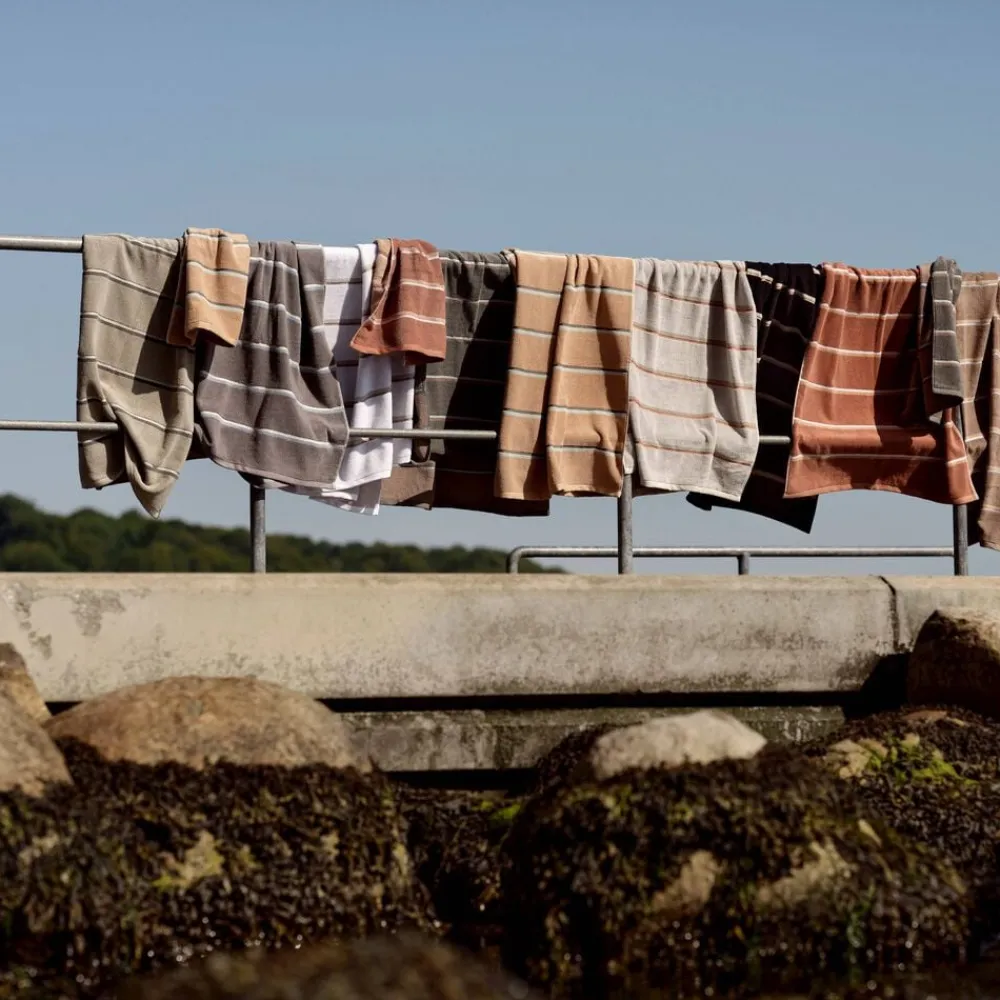 Sauna er navnet – og striberne taler for sig selv. Serien er inspireret af de stramme linjer i en klassisk træbeklædt sauna, hvor designet leger elegant med perspektiv og farvebalance. Hver side af håndklædet fremhæver sin egen dominerende farve – en fin detalje, der giver dig to forskellige udtryk i ét og samme håndklæde