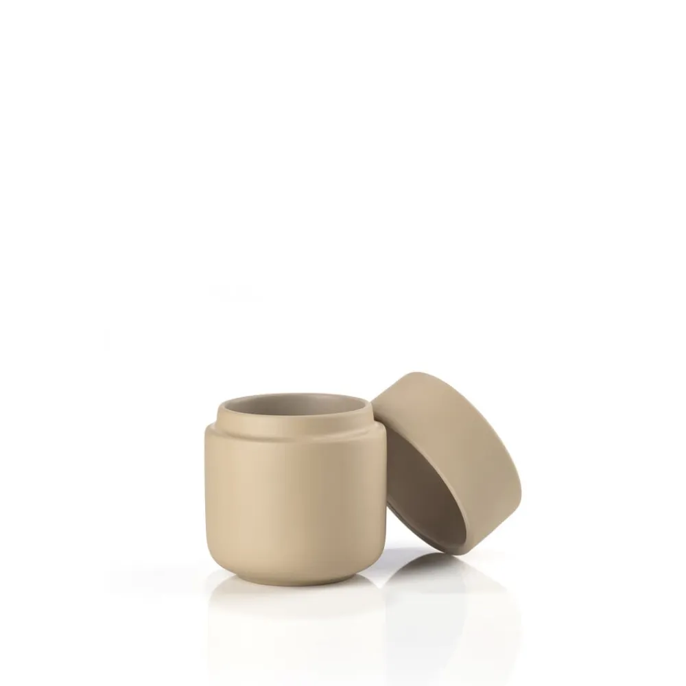 Keramikkrukken med låg har samme enkle, organiske formsprog som resten af den skønne badserie Ume. Den kan rumme dine hårspænder, makeup, vatpinde, vatrondeller eller hvad du ellers har behov for at ha’ ved hånden, men ikke nødvendigvis i syne, på badeværelset.