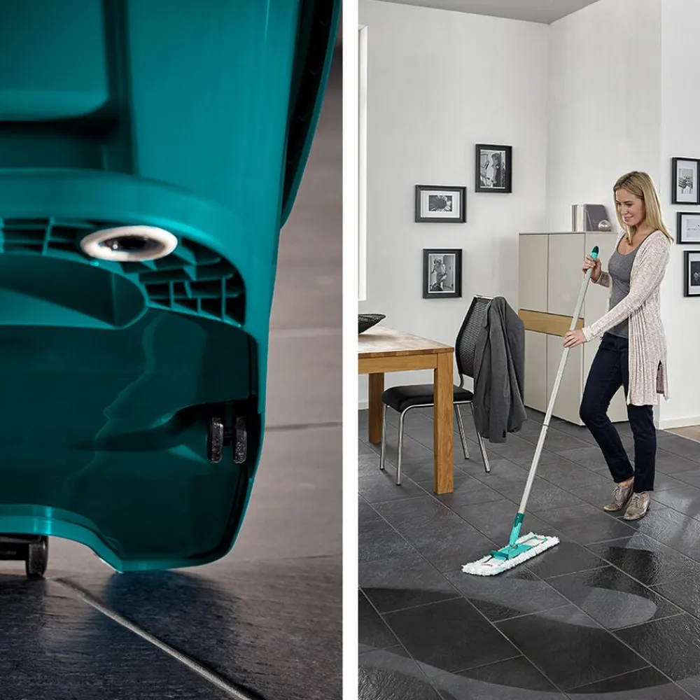 Med det fleksible 360 ° drejeled kan du effektivt føre gulvvaskeren rundt i bløde sving og komme ubesværet omkring bord- og skabsben og under møbler og senge. Dobbeltfiber-kluden når de mindste fordybninger og fjerner selv genstridigt snavs grundigt. Spanden har to letrullende hjul og skubbes nemt omkring.