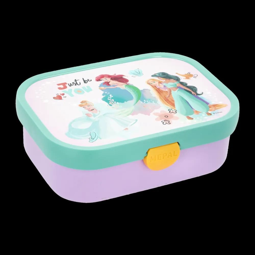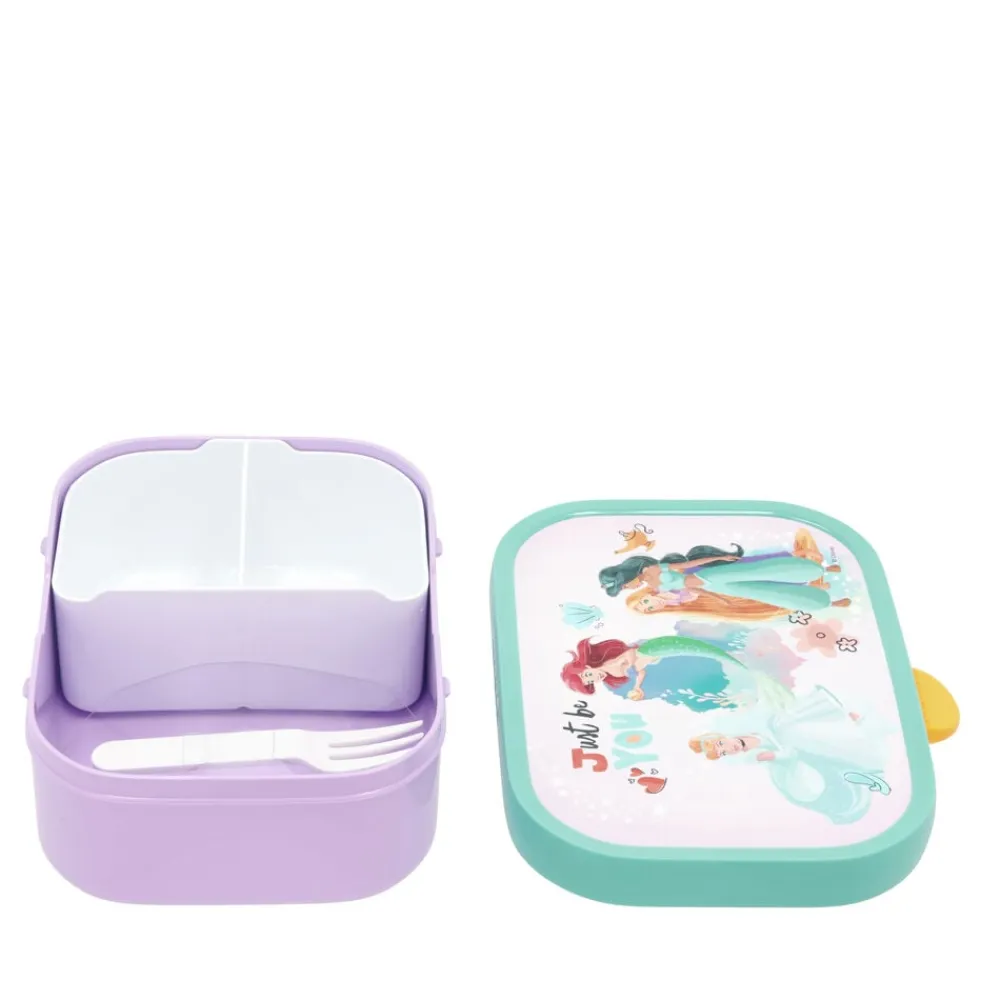 Robust og rummelig Mepal madkasse med Disney Princess-motiv. Madkassen har en smart og effektiv lukkemekanisme, som er nem for børnene at betjene. Madkassen måler 17,5 x 13 x 6 cm og indeholder en lille gaffel og en aftagelig indsats med to små rum.