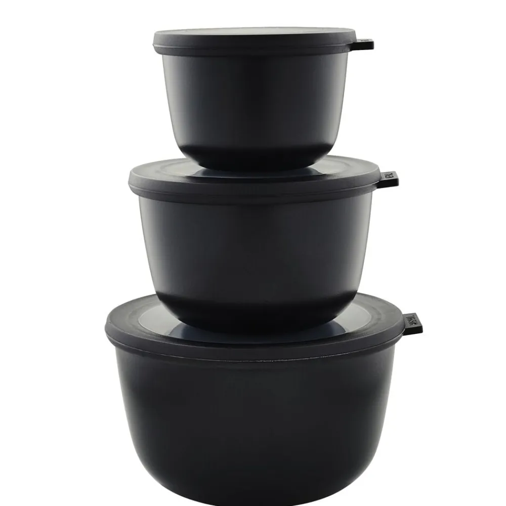 Mepal Cirqula opbevarings- og serveringsskålesæt – rummelig, praktisk og dekorativ i kølige, nordiske farvetoner. Sæt bestående af 500 ml, 1000 ml og 2000 ml.