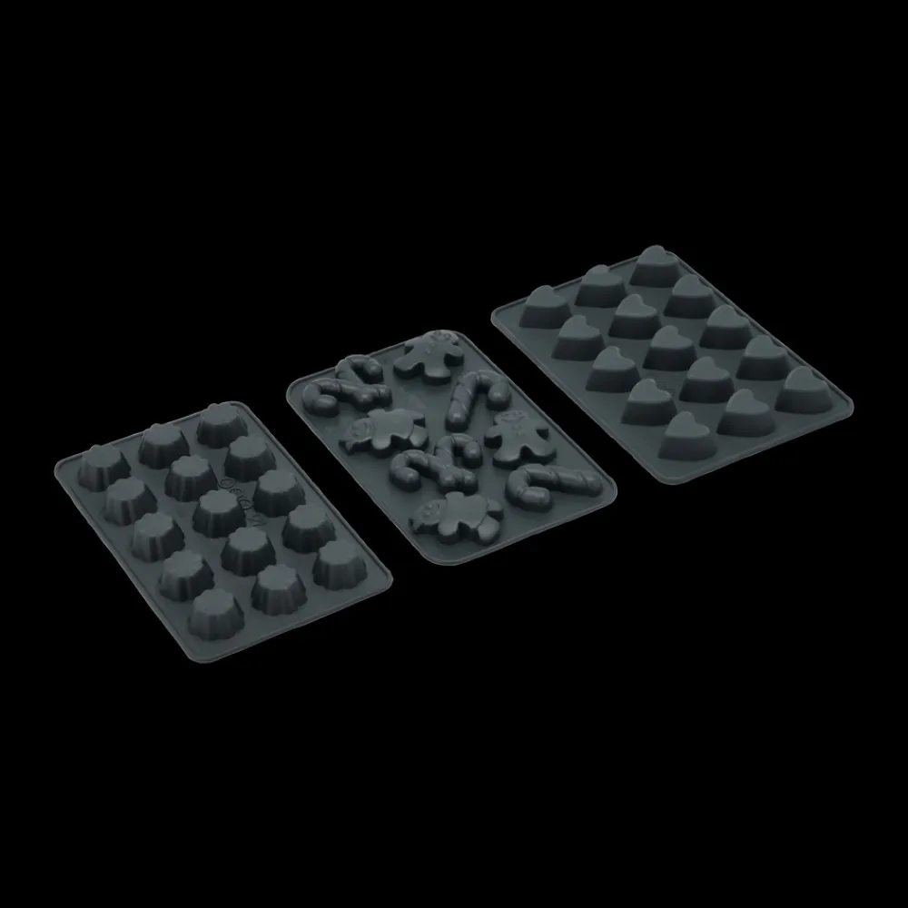 Chokoladeforme i grå silikone med 3 forskellige temaer, så du kan støbe de fineste, små chokoladefigurer. Formsættet giver 15 blomster, 15 hjerter og 8 søde julemotiver. Den bløde silikone gør det nemt at vende de støbte figurer ud af formene. Velegnet til opvaskemaskine og fryser ned til -20° C. 10,8 x 17,4 cm.