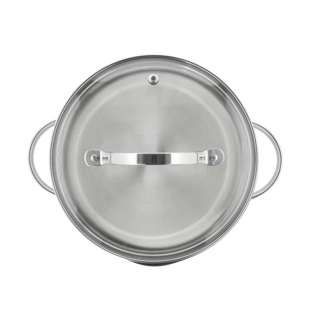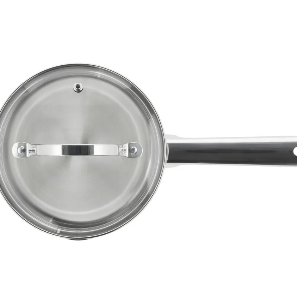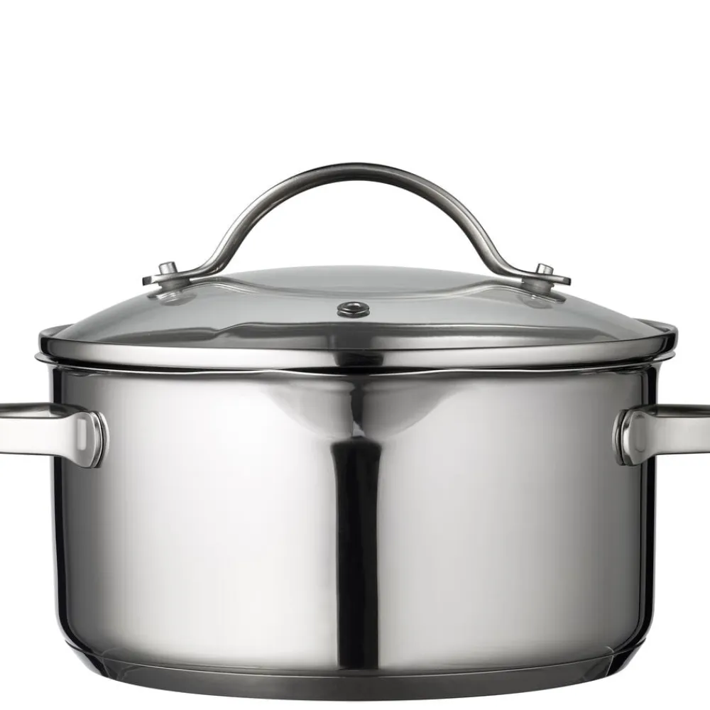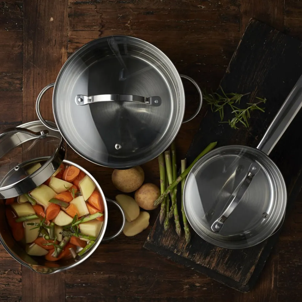 Glaslåg med si-funktion på to sider af låget sikrer, at vand kan hældes fra gryden uden at indhold kommer med.