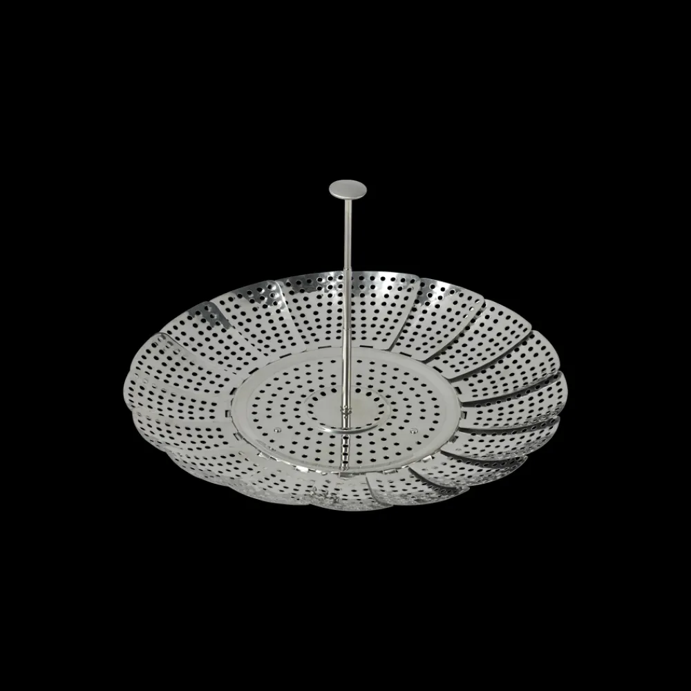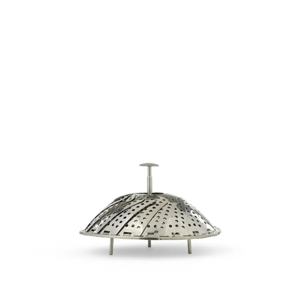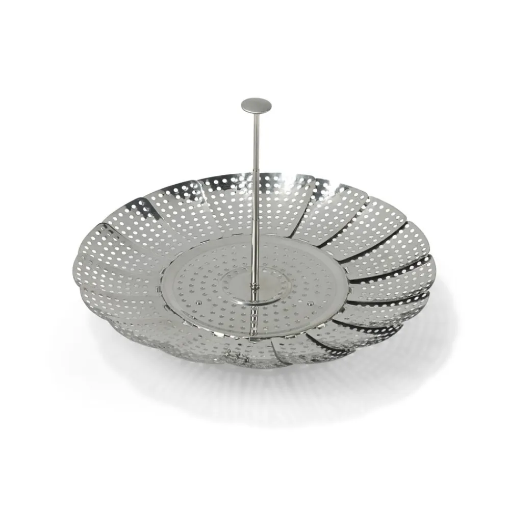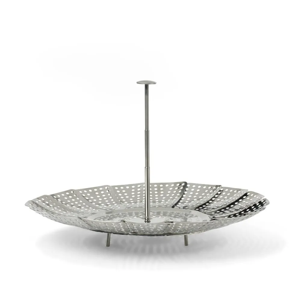 Dampede grøntsager smager af mere og bevarer vitaminerne bedre. Dampindsatsen sættes ned i en gryde med lidt vand og er også velegnet til dampning af fisk og skaldyr. Dia. 28 cm, rustfrit stål med foldbare ben og teleskophåndtag.