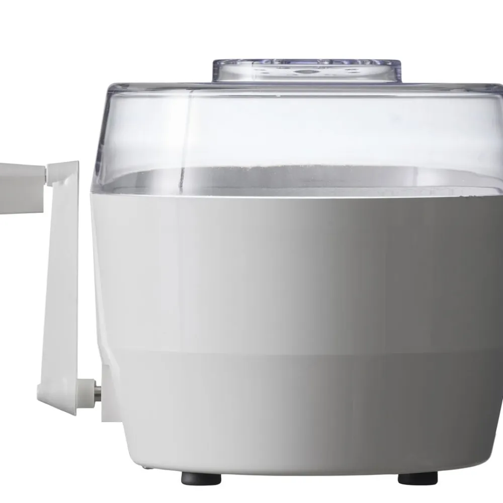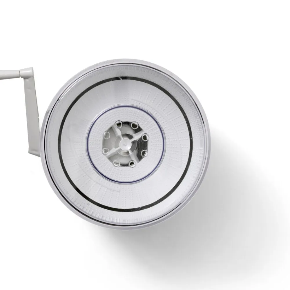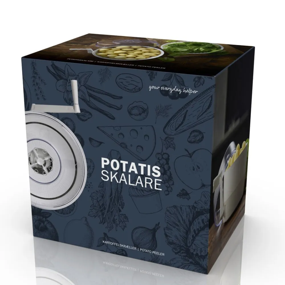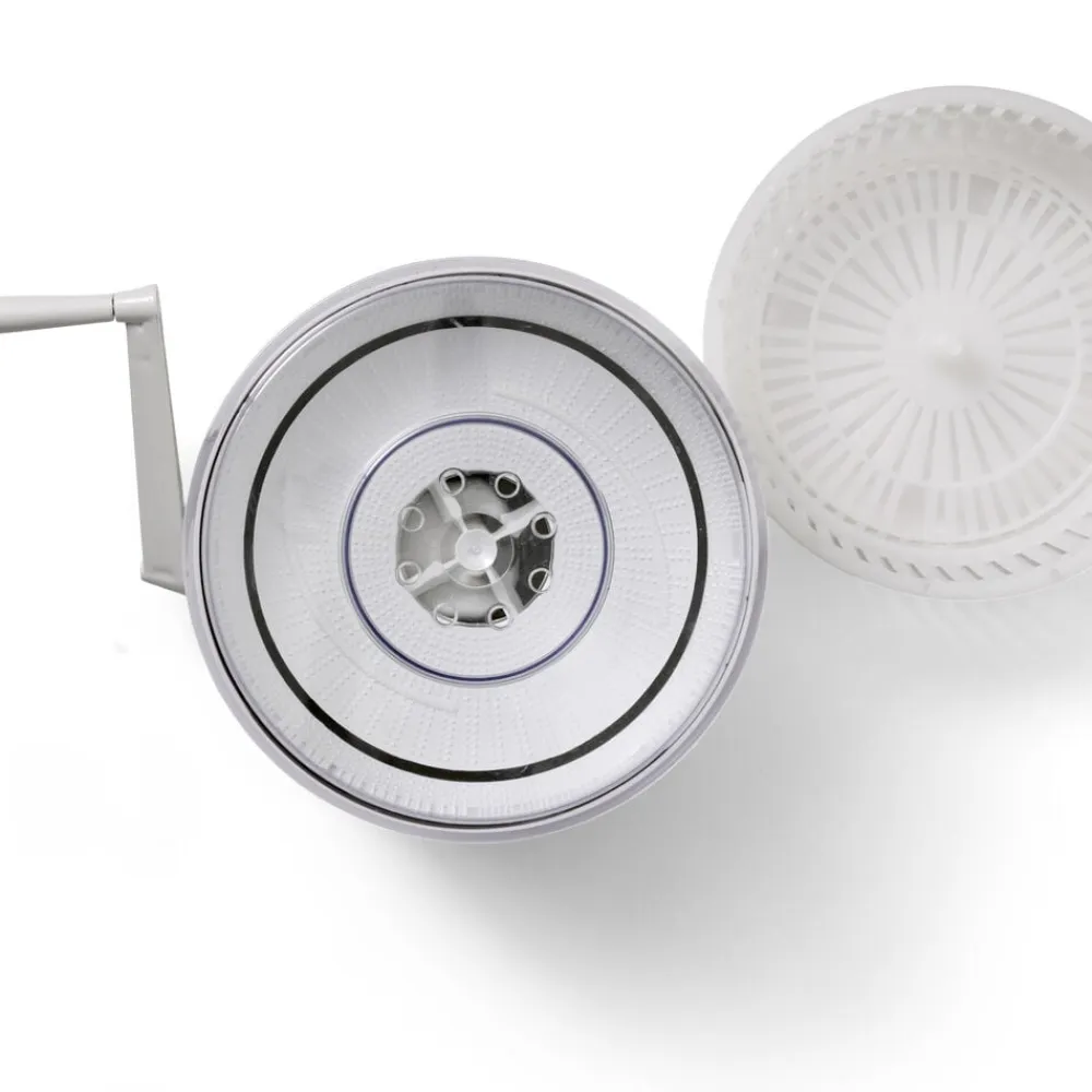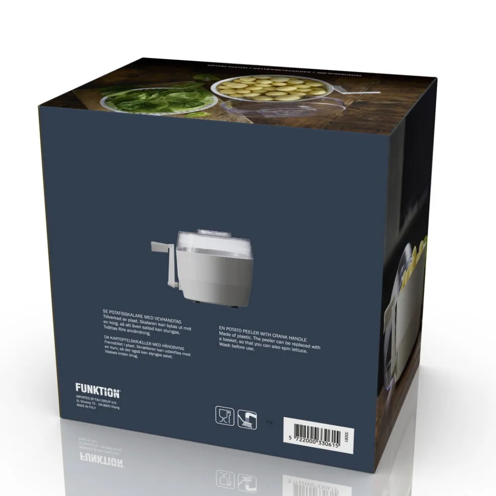 Kartoffelskræller med håndsving. Fremstillet i plast. Skrælleren kan udskiftes med en kurv, så der også kan slynges salat. Vaskes inden brug.