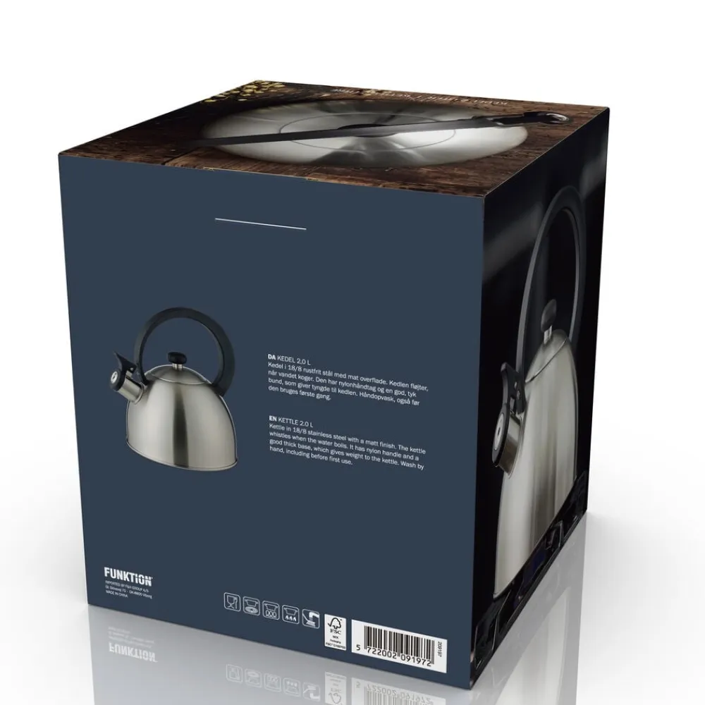 Kedel i 18/8 rustfrit stål med mat overflade. Rummer 2 liter. Kedlen fløjter, når vandet koger.