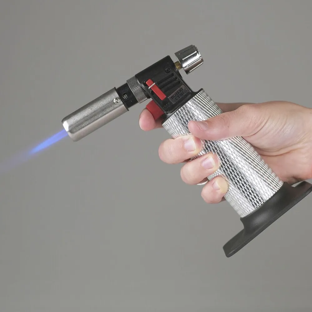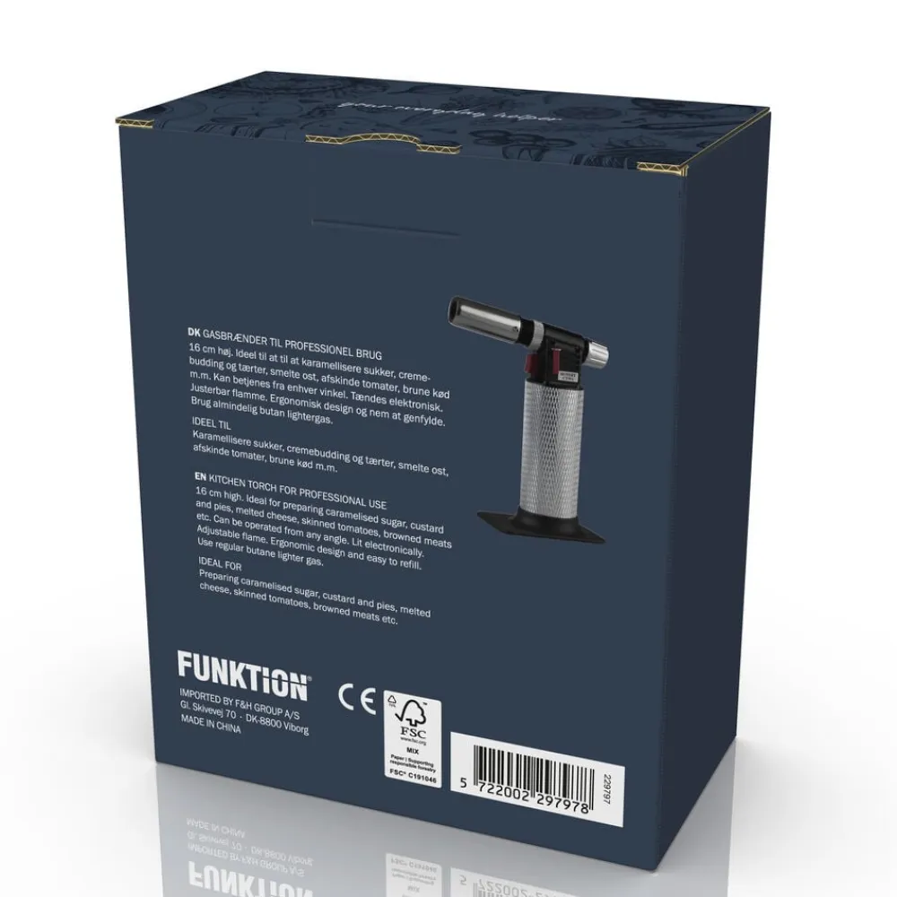 Gasbrænder til professionel brug. 16 cm høj. Ideel til at karamellisere sukker, cremebudding og tærter, smelte ost, afskinde tomater, brune kød m.m. Kan betjenes fra enhver vinkel. Tændes elektronisk. Justerbar flamme. Ergonomisk design og nem at genfylde. Brug almindelig butan lightergas.