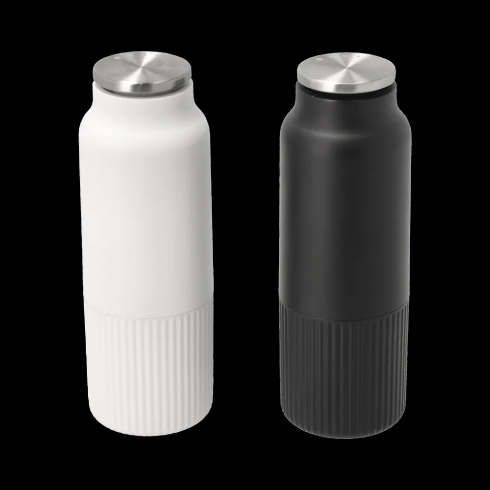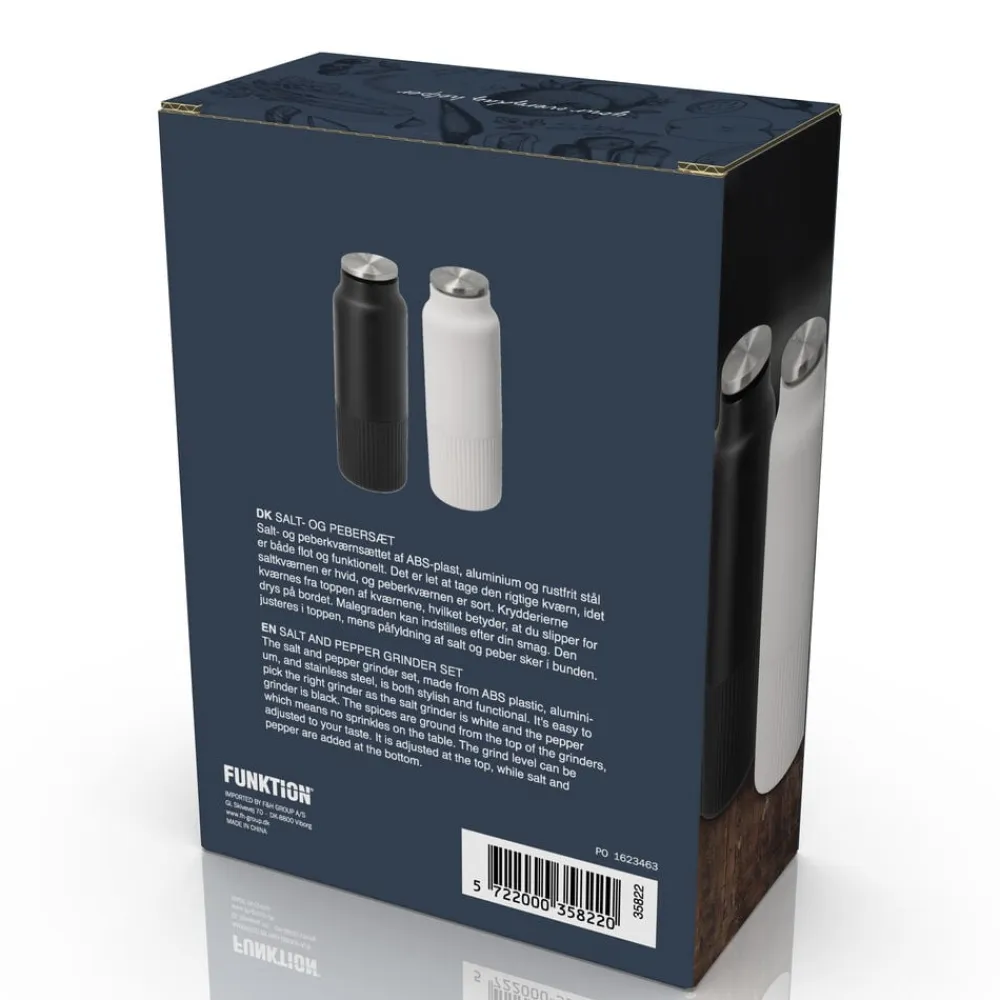 Salt- og peberkværnsættet af ABS-plast, aluminium og rustfrit stål er både flot og funktionelt. Det er let at tage den rigtige kværn, idet saltkværnen er hvid, og peberkværnen er sort. Krydderierne kværnes fra toppen af kværnene, hvilket betyder, at du slipper for drys på bordet. Malegraden kan indstilles efter din smag. Den justeres i toppen, mens påfyldning af salt og peber sker i bunden. Kværnenes højde er 16,5 cm med en diameter på 5,7 cm.
