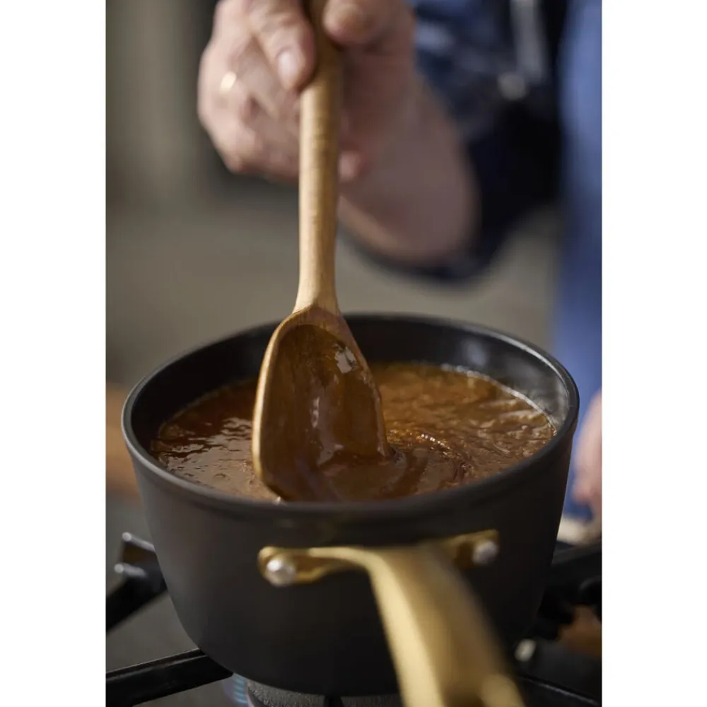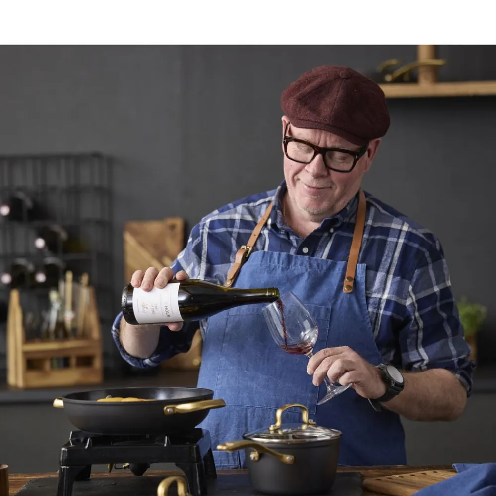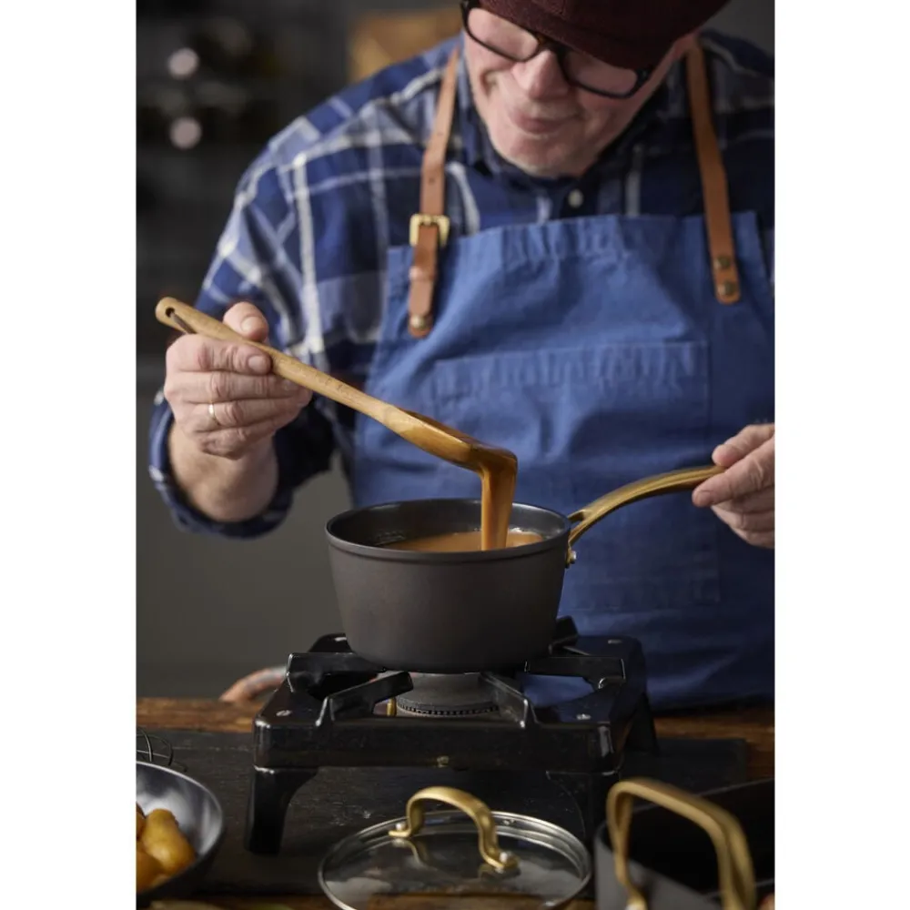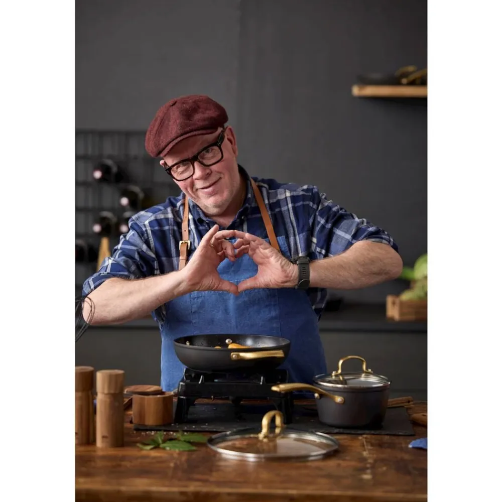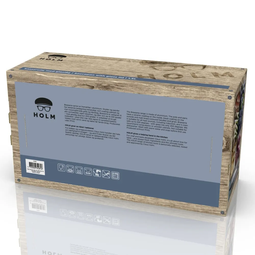 Brasserie-serien er fremstillet i aluminium. Gryder og pander har keramisk belægning indvendigt, sort coating udenpå og mat messingfarvede greb og håndtag. Brasserie er velegnet til alle varmekilder, også induktion, og tåler ovn op til 220 grader – med glaslåg dog kun 200 grader. Vi anbefaler at bruge redskaber i plast eller træ. Ikke egnet til opvaskemaskine. Vaskes med varmt vand og sæbe før første brug. Den keramiske belægning er fremstillet af råvarer, der ikke indeholder PFAS.