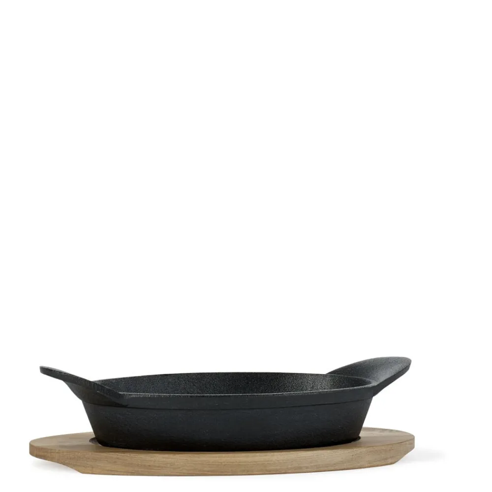 Fad/tallerken i støbejern og bordskåner i ahorn. Egner sig perfekt til servering, men også til tilberedning i grill eller ovn.