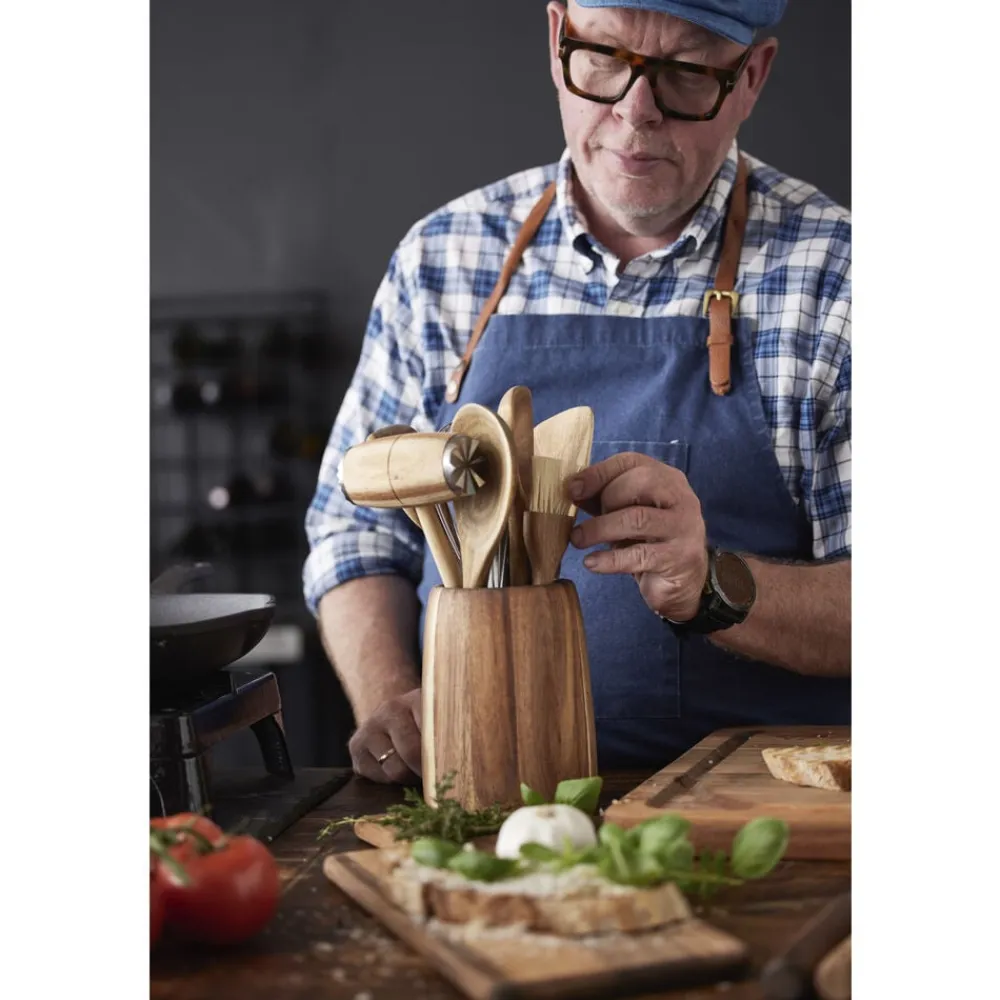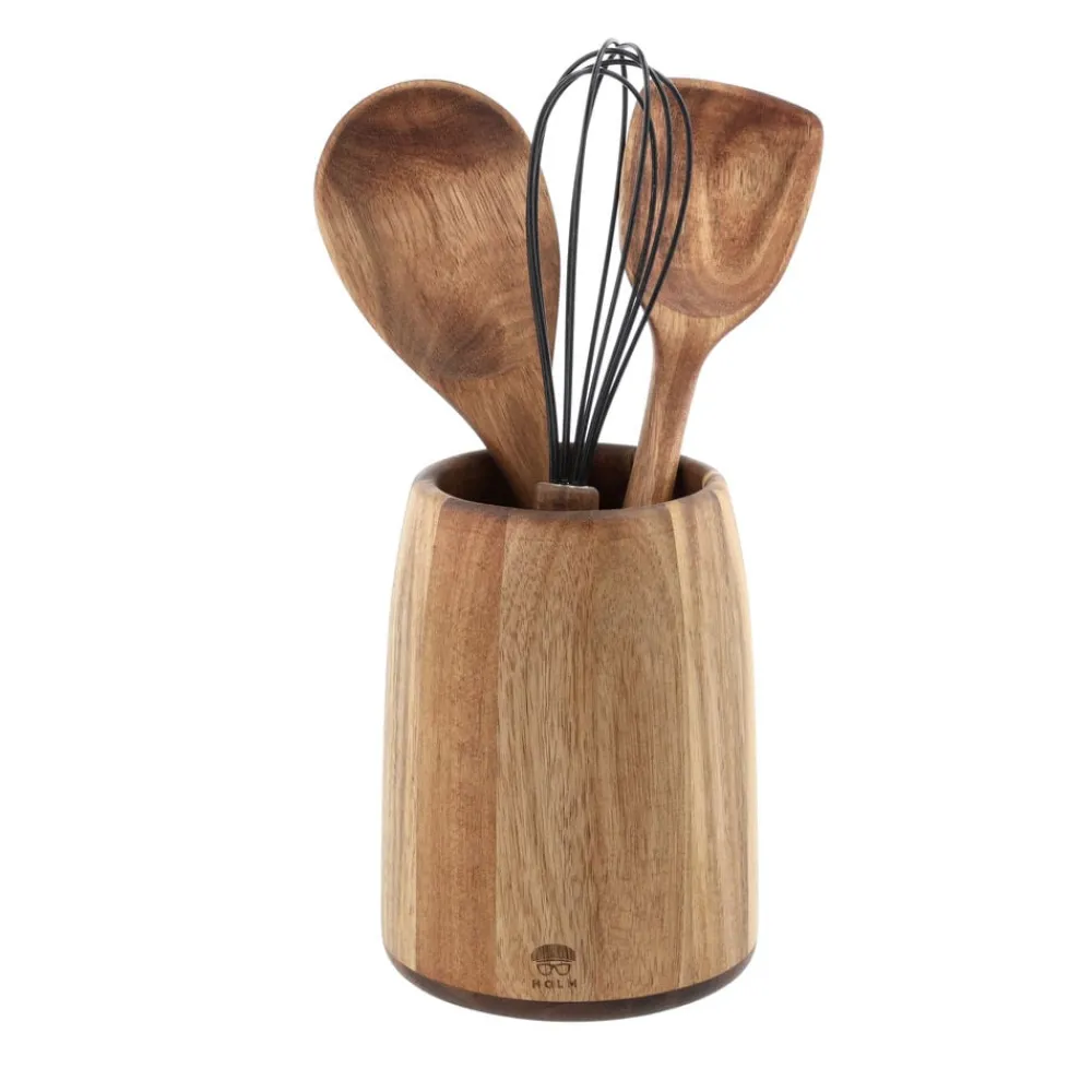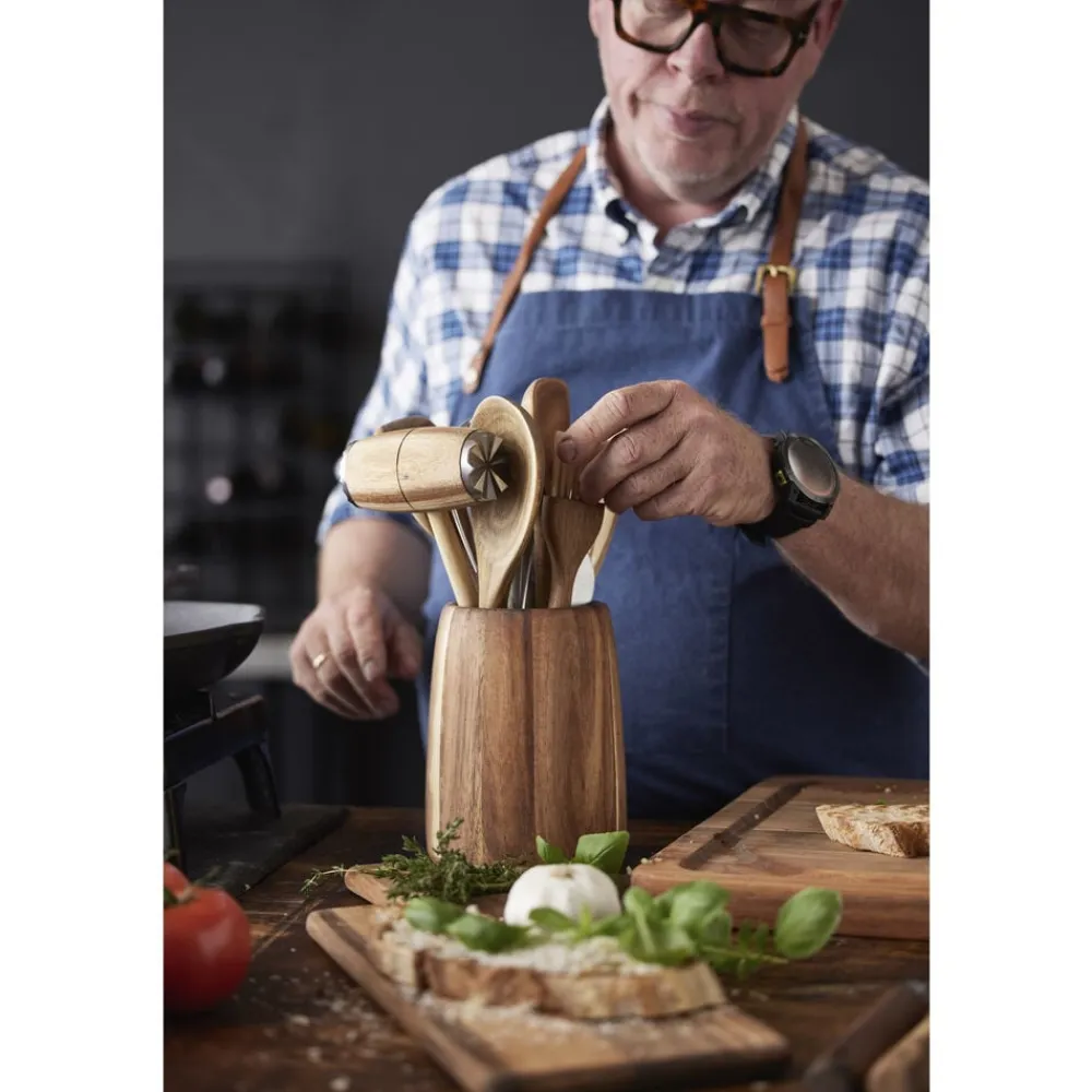Redskabsholder i akacietræ. Placer grydeskeer, piskeris og andre køkkenredskaber i redskabsholderen eller brug den til krydderurter. Med sit flotte design kan den sagtens stå fremme i køkkenet, så du altid har det hele tæt på, når du skal lave mad. Dia. 13 x 17 cm.