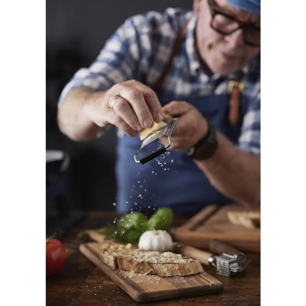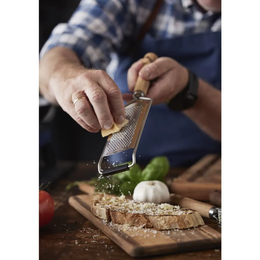 Fint rivejern med stor riveflade i rustfrit stål og skaft af akacietræ. Velegnet til parmesanost, muskatnød, hvidløg, citronskal og lignende. Rivejernet har en trekantet silikoneforstærkning i bunden, så det står bedre fast, når du støtter det mod underlaget ved brug, samt beskyttende skærebladsværn for sikker opbevaring.