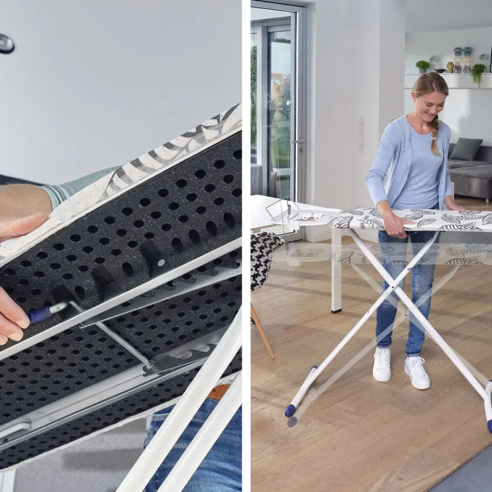 Airboard Express L Solid har alt, hvad et moderne strygebræt har brug for. Strygebrættet er ultralet og stabilt med ekstra stor strygeflade. Strygeoverfladen måler 130 x 38 cm og arbejdshøjden kan justeres mellem 76 og 100 cm. Airboard Express L Solid er både nemt at stille op og folde sammen. Strygebrættet har en fast bakke til dampstationer samt en kabelholder, så ledningen ikke er i vejen for strygningen. Skjorter m.m. kan hænges på bøjleholderen på bakken efter strygning. Velegnet til strygejern og alle standarddampstationer. 5 års garanti