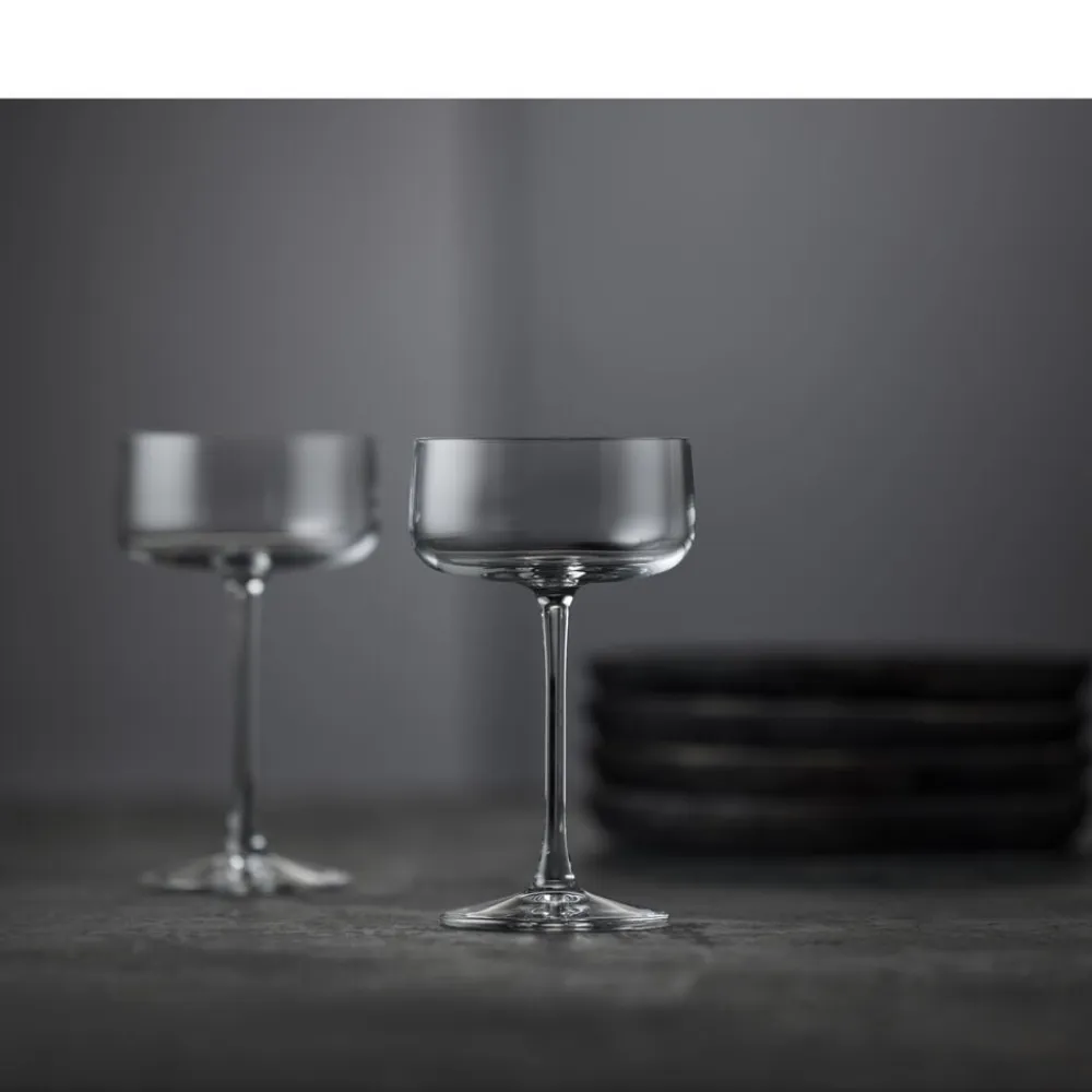 4 smukke champagneskåle fra glasserien Zero fra Lyngby Glas. Nyd den perlende champagne og glassenes fine elegance. Tåler opvaskemaskine. 26 cl, højde 16 cm.