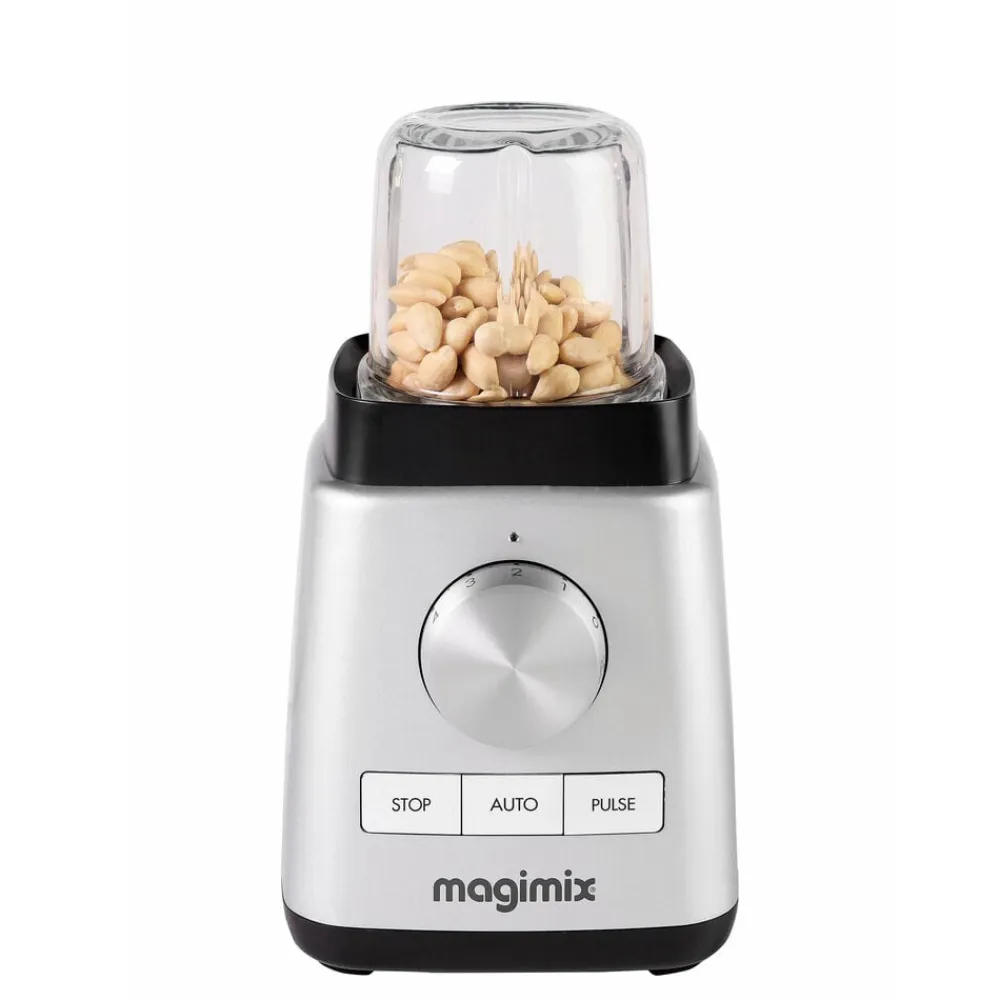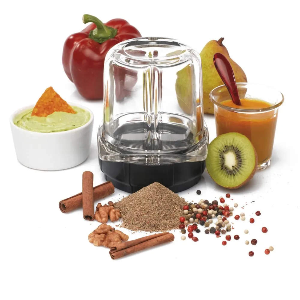 Kraftfuld minihakker til at montere på Magimix blender. Hakker ingredienserne hurtigt og effektivt. De skarpe skæreblade er meget velegnet til vidt forskellige hakkeopgaver, fx krydderier, kød, grøntsager eller babymad. Eksempler på kapacitet: Nødder 100 g. Babymad 200 g. Løg 100 g. Råt kød i tern 200 g.