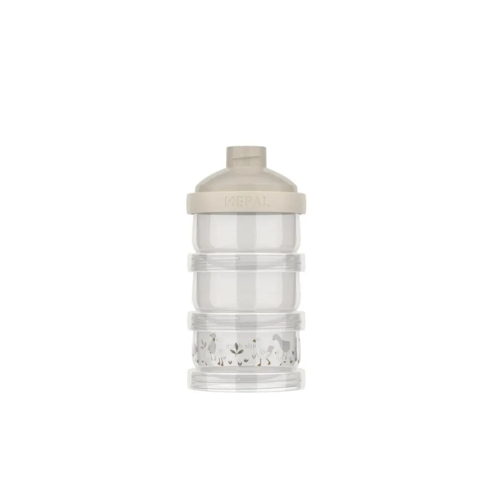Med det tredelte Mepal Mio mælkepulvertårn er det nemt og hygiejnisk at have mælkepulver med dig overalt. De tre stabelbare beholdere på hver 120 ml er lukkes individuelt med skruelåg. Toppen har lufttæt forsegling, og den smarte hældetud gør det let at hælde mælkepulver i en flaske. Det kompakte design er ideelt til rejser og nemt at rengøre i opvaskemaskinen. Mælkepulvertårnet tåler desuden køleskab, fryser og mikroovn. Diameter 7,8 cm, højde 15,7 cm. PP-plast.
