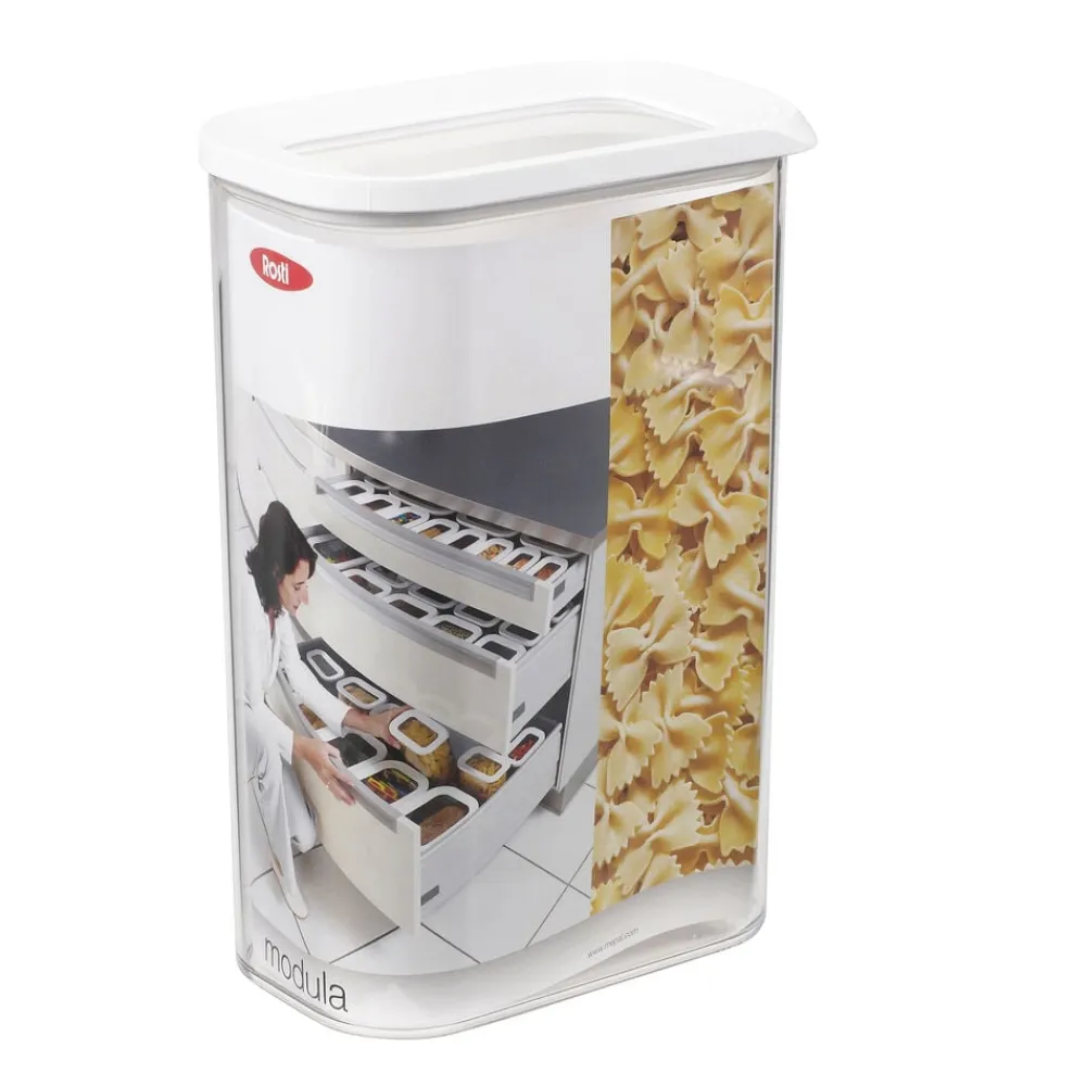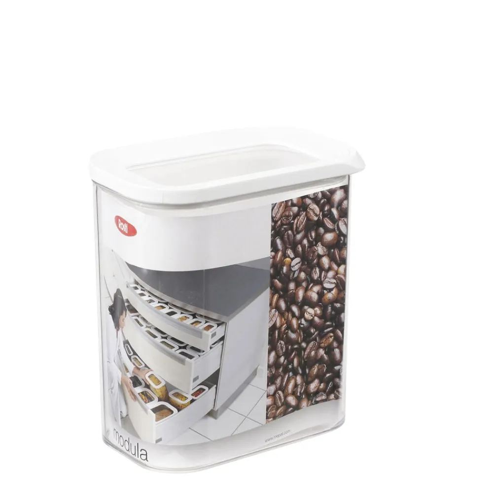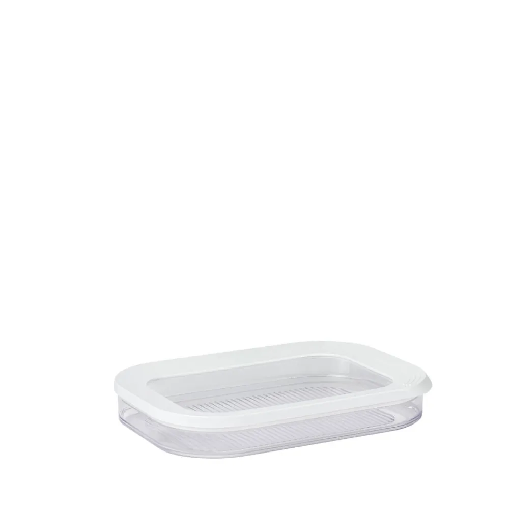 Modula opbevaringsboks med enkel, hvid kant på låget. Både boks og låg er gennemsigtige, hvilket gør det nemt at overskue indholdet. Mål: 14,5 x 9 x 5,5 cm. Boksen er fremstillet af SAN-plast, som er robust og modstandsdygtig overfor ridser. Velegnet til opvaskemaskine men ikke til mikroovn og fryser.