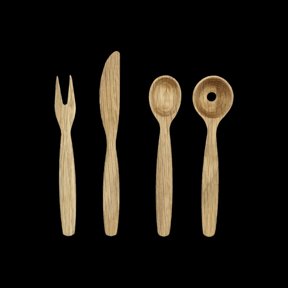 Med det stilfulde tapassæt er der lagt op til lækre hyggestunder med venner og familie. Sættet består af en olivenske, en almindelig ske og en smart gaffel, alle 14 cm, og en kniv på 16 cm.