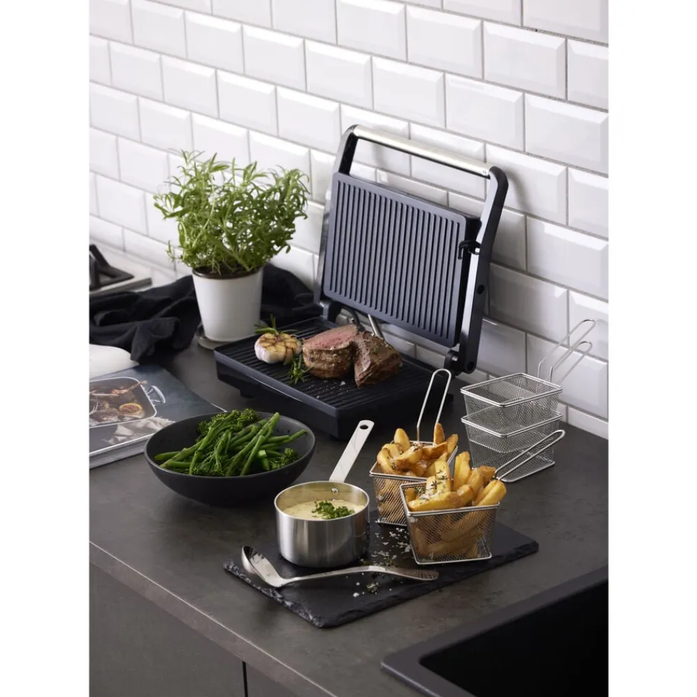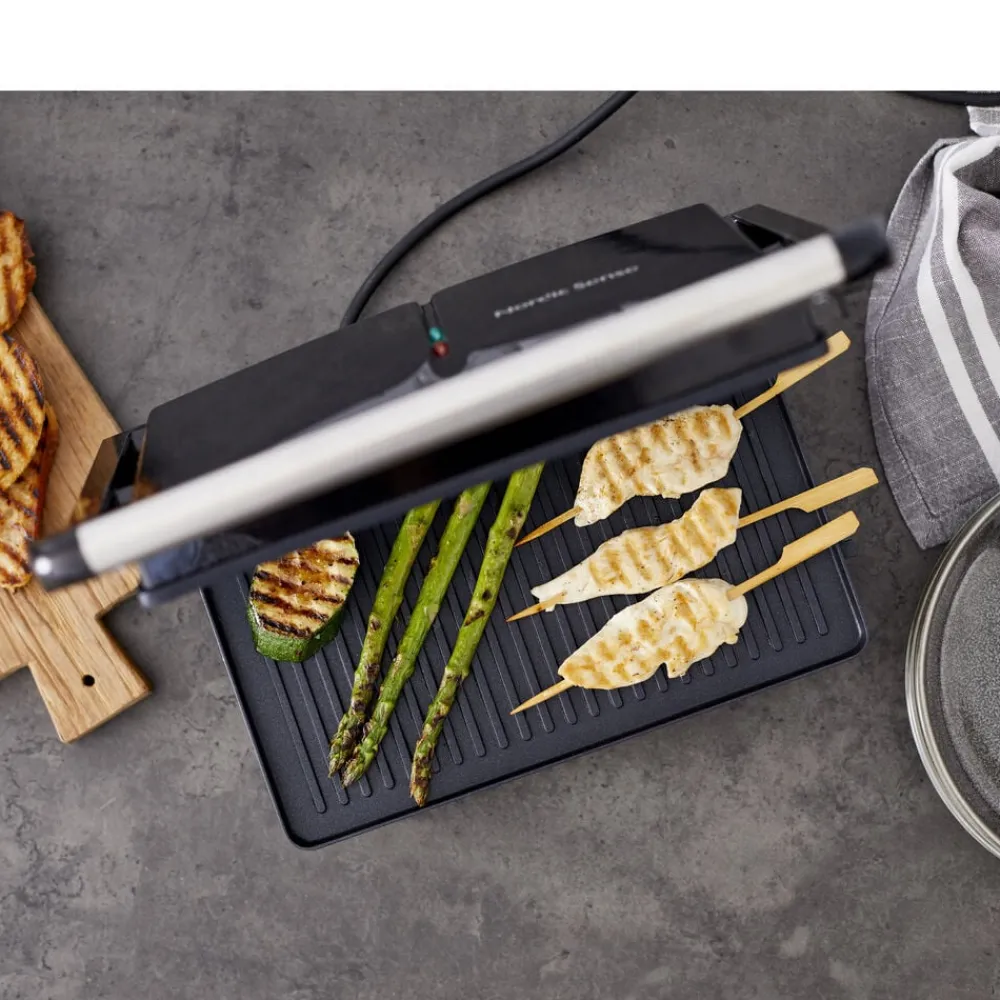 Lille paninigrill med en grillflade på 18 x 28 cm. Perfekt til brød og til at varme store stykker grøntsager eller en lækker sandwich. Grillpladen har non-stick belægning, og låget er med vippehængsler, så det ligger vandret, selv ovenpå høje fødevarer.