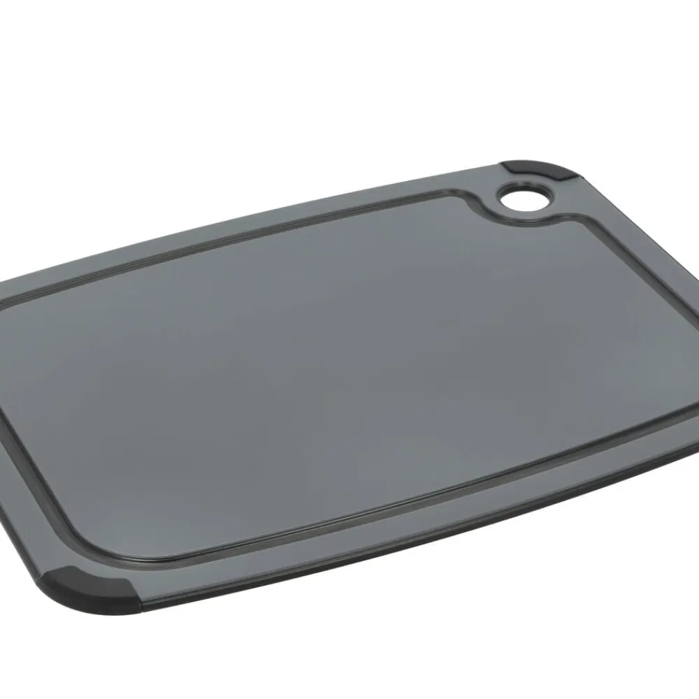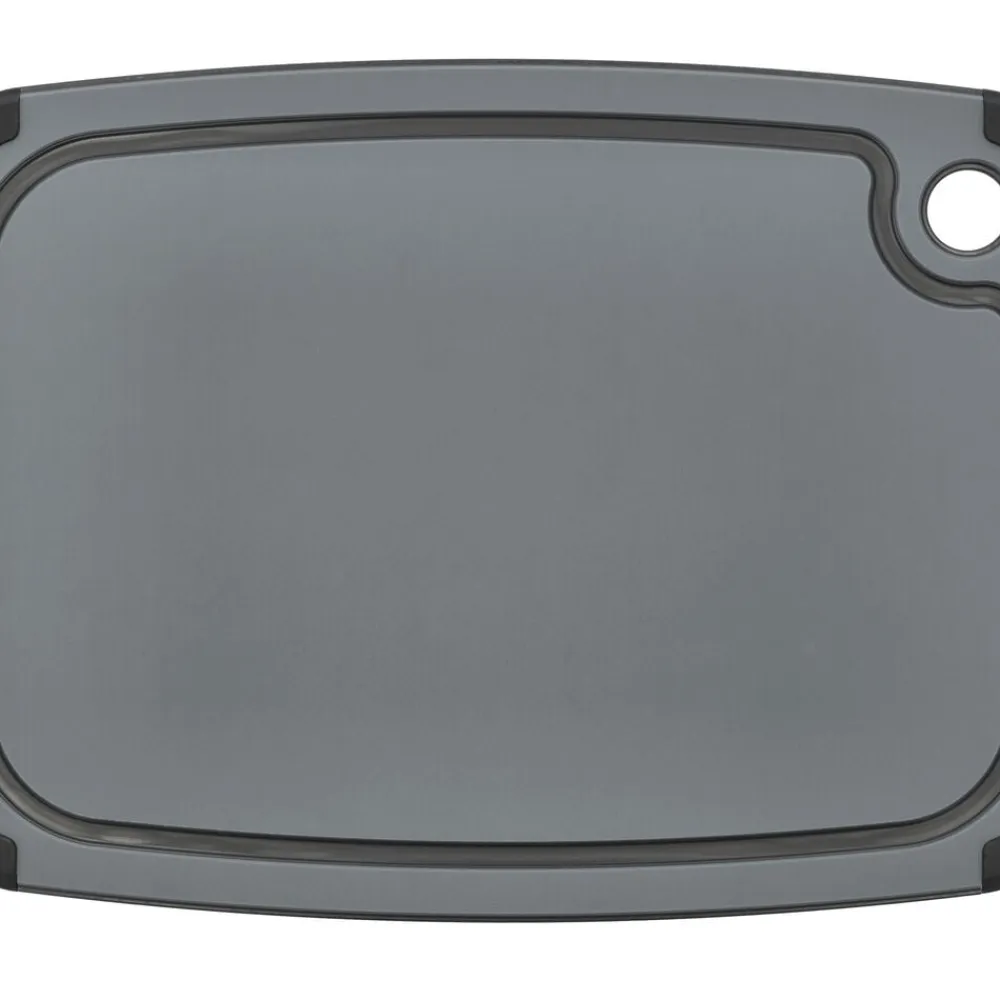 Skærebræt med praktiske silikonekanter, som sørger for, at brættet ligger stabilt på bordet, mens du hakker og skærer. Det kan anvendes på begge sider – den ene side har en bred saftrille til saftige madvarer og en glat side til alt det andet. Velegnet til opvaskemaskine.