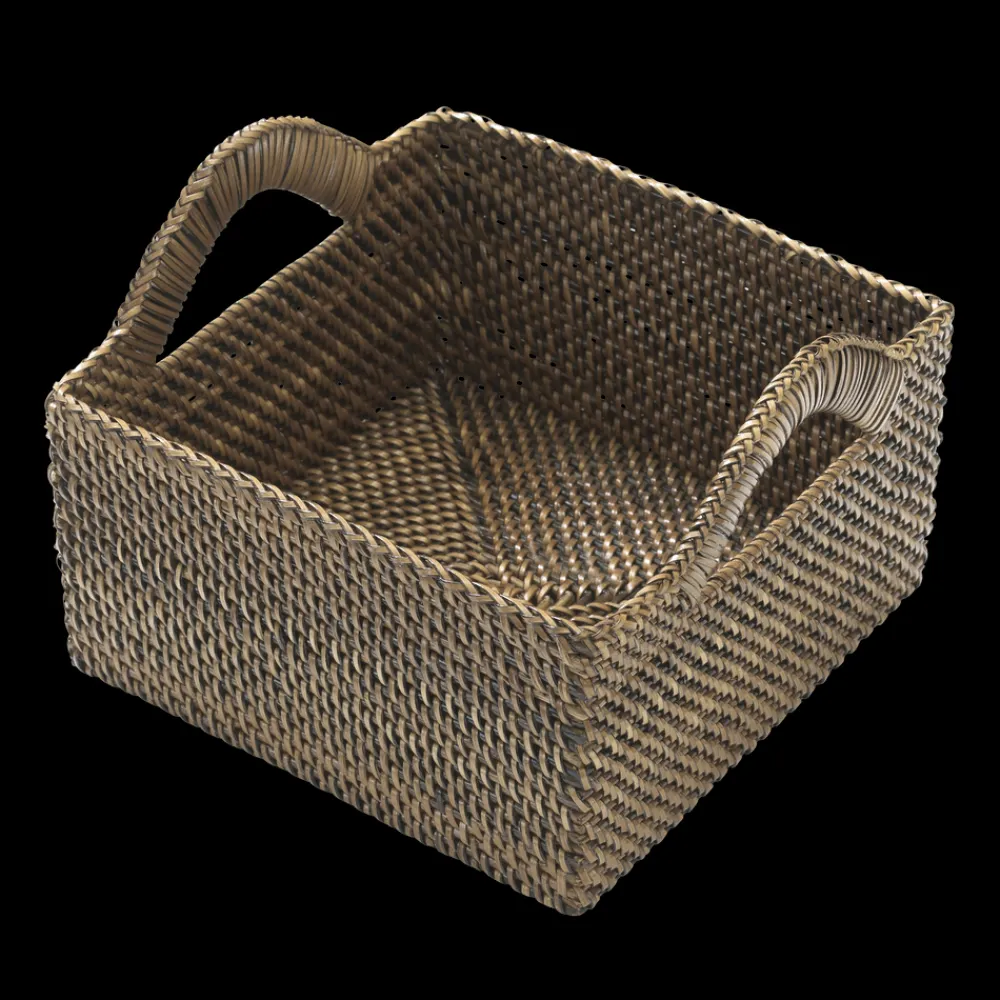 Denne kvadratiske kurv med håndtag er både stilfuld og praktisk. Kurven måler 18 x 18 x 9,5 cm, og den kompakte størrelse gør den velegnet til opbevaring af små genstande. (CP17)