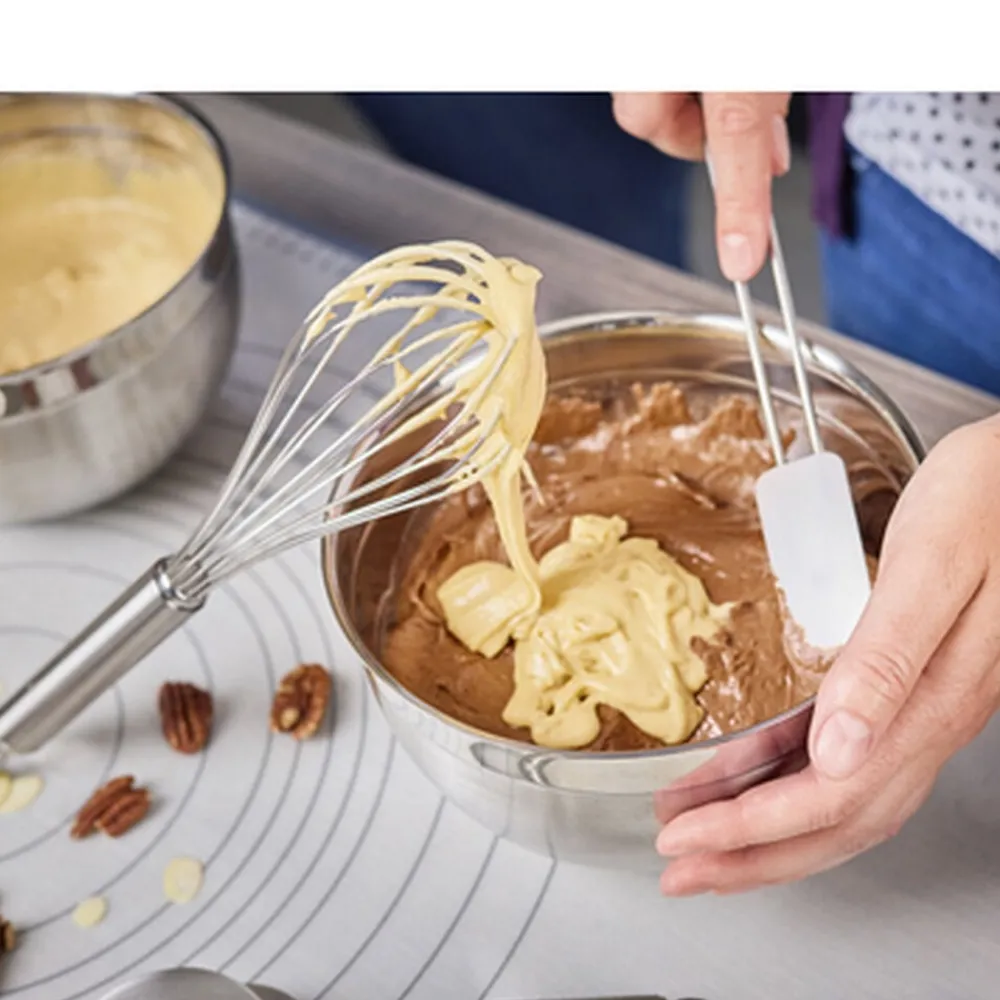 RÖSLE dejskraber med slidstærk silikone klarer temperaturer fra -30 °C til +230 °C samt fedtstoffer, olie m.m. Den fleksible side af silikonebladet tilpasser sig skålens form, mens den hårdere side er perfekt til at udglatte. Tåler opvaskemaskine.