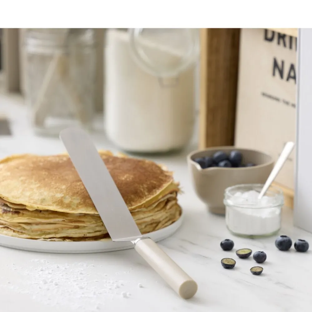 Emma stålpalet har et langt, smalt blad med knæk, som gør den perfekt til at vende pandekager, smøre glasur og meget mere. Den er et køkkenredskab, du vil gribe igen og igen og nyde foreningen af stil og funktionalitet. Nem at rengøre i opvaskemaskinen.