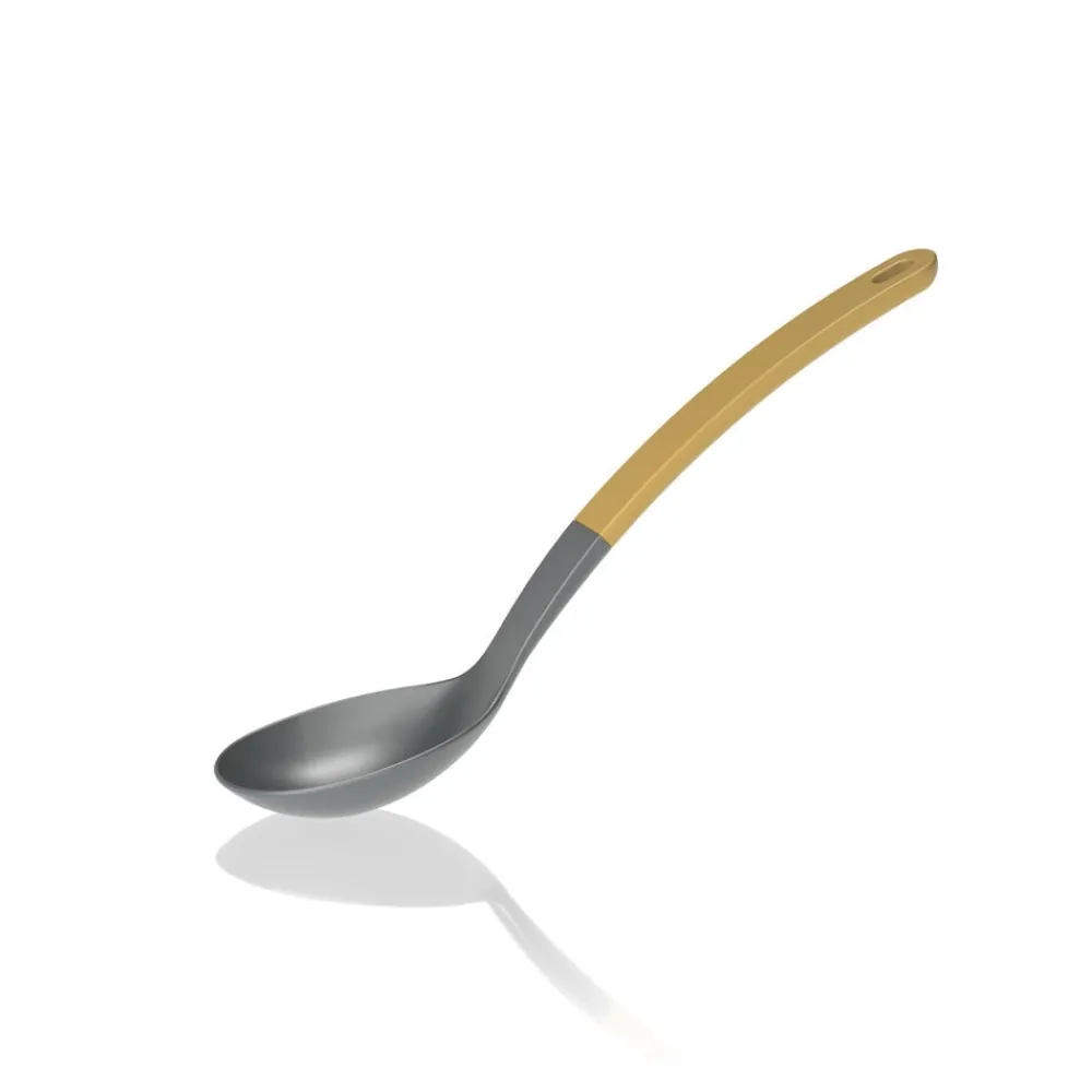Serveringsske med farvet skaft. 29 cm. Lige til at stikke i skålen eller gryden og sætte på bordet. Fremstillet i nylon, der er skånsomt mod gryder og pander med belægning og tåler varme op til 220 grader C. Ergonomisk design med praktisk ophængshul. Velegnet til opvaskemaskine.