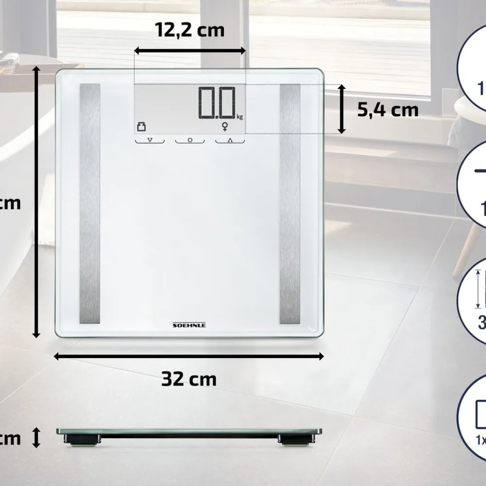 Kropsanalysevægt fra Soehnle i topkvalitet, som beregner både fedt, muskler og væske i kroppen. Viser også dit beregnede, daglige kaloriebehov.