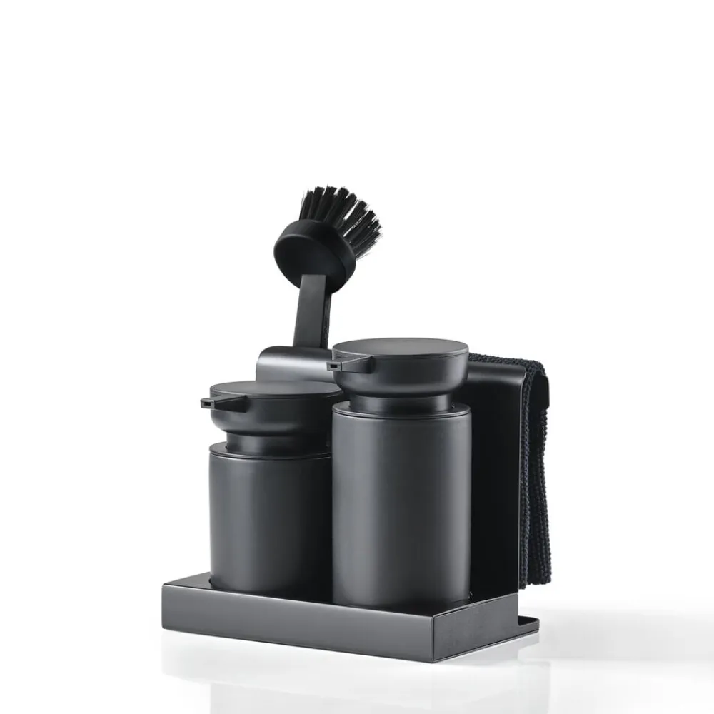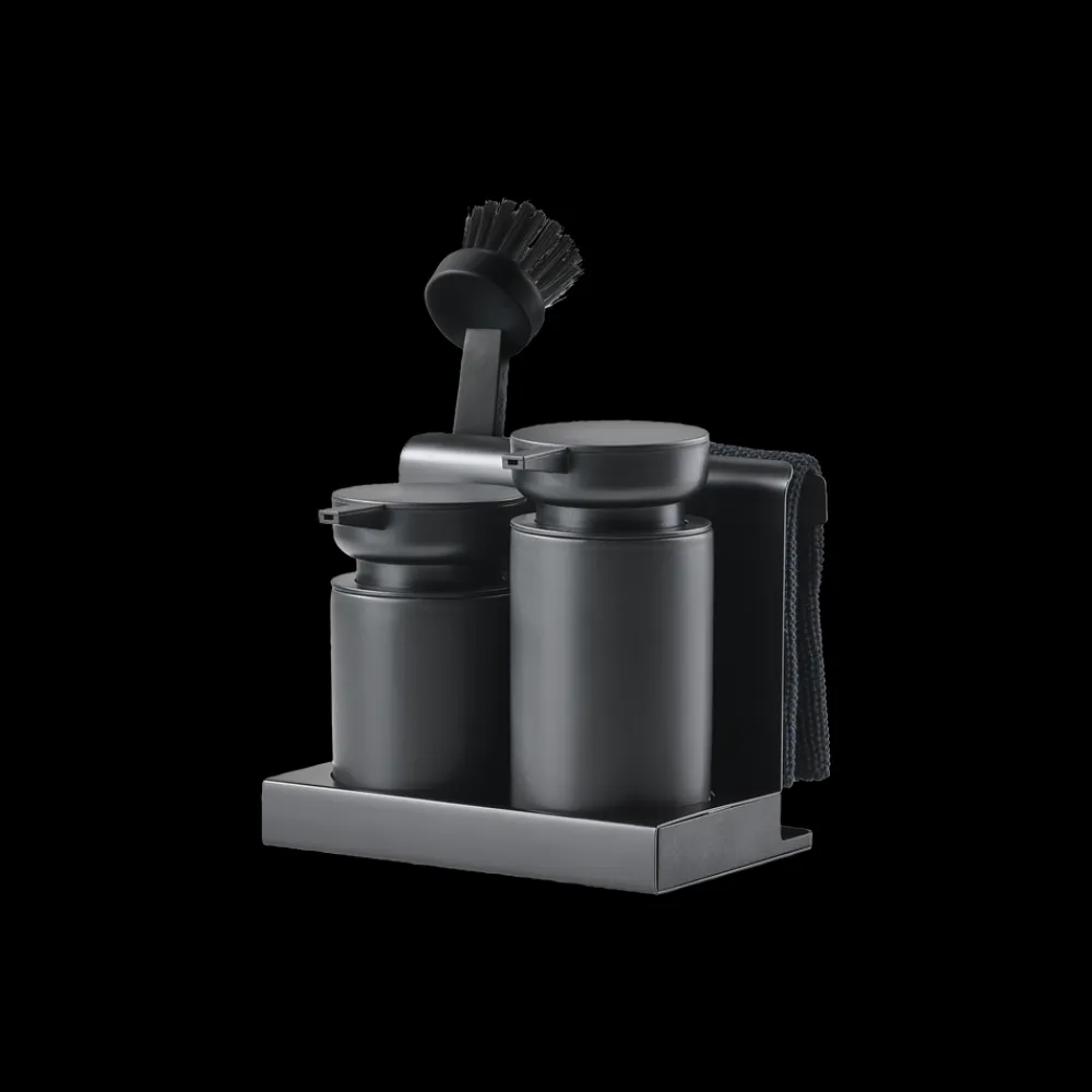 I front står dispenser-duoen til opvaskemiddel og håndsæbe/sprit. Begge dele er udført i keramik. Backstage hænger den strikkede karklud til tørre ganske uset, til den skal i brug. Den får selskab af børsten i matchende farve. En sidste fiks detalje er den lille bundbakke, der opsamler overskydende vand, så det ikke ender på køkkenbordet.