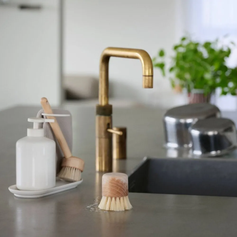 Her er lige dét, du skal bruge til hverdagens opvask, hverken mere eller mindre. En god og behagelig børste, en rummelig dispenser til sæbe, en matchende karklud samt en silikonebakke, der sætter scenen på smukkeste vis. Stålstellet, der holder sættet samlet, er rundet i toppen, så det set ovenfra former en fin halvcirkel. Den er let at gribe om, så du kan flytte sættet, når du fx skal gøre rent. Samtidig tilbyder stellet børsten et sted at hvile og kluden en plads at tørre på. Gennemtænkt, fint og feminint design fra NEU Studio.