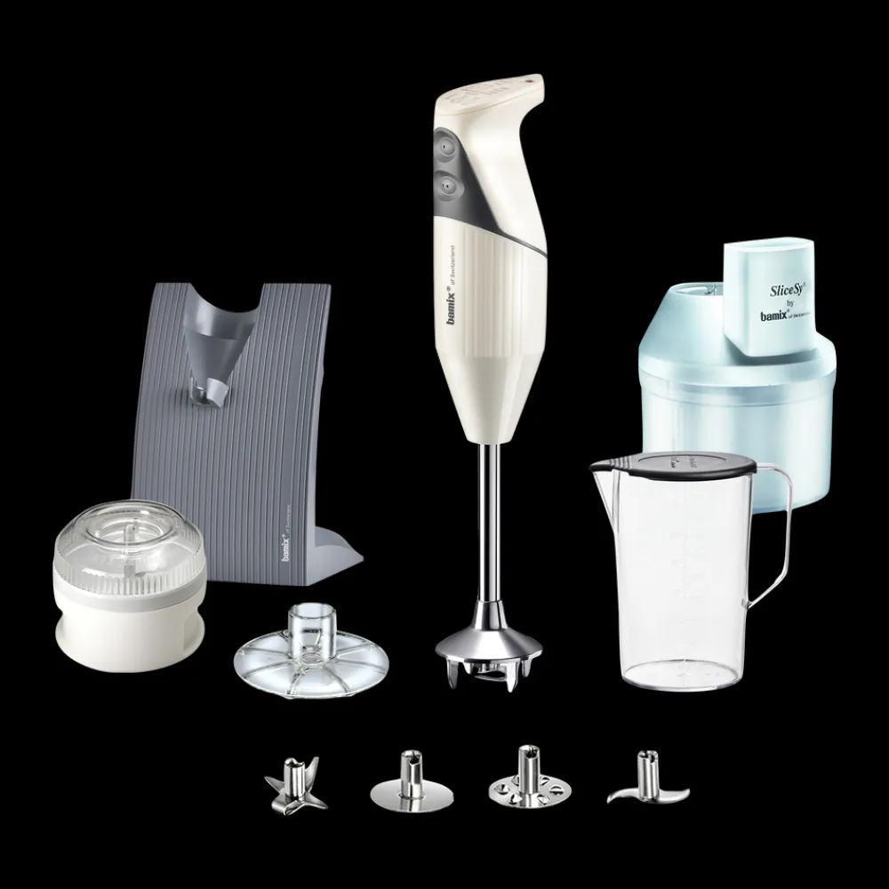 Med din bamix® Swissline Superbox og dens tilbehør kan du piske, purere, løsne, røre, blende, snitte, mikse, male, rive, skære og hakke.