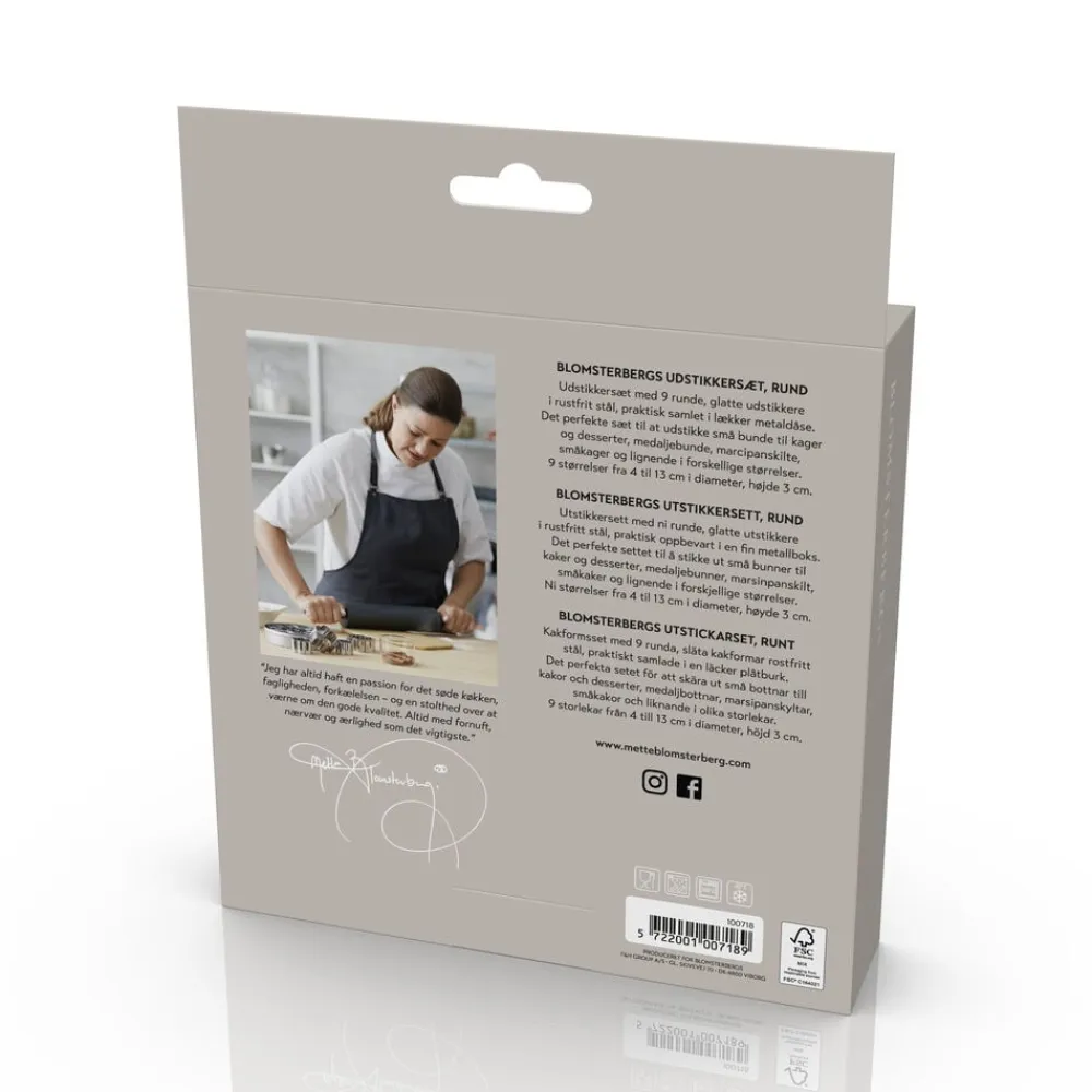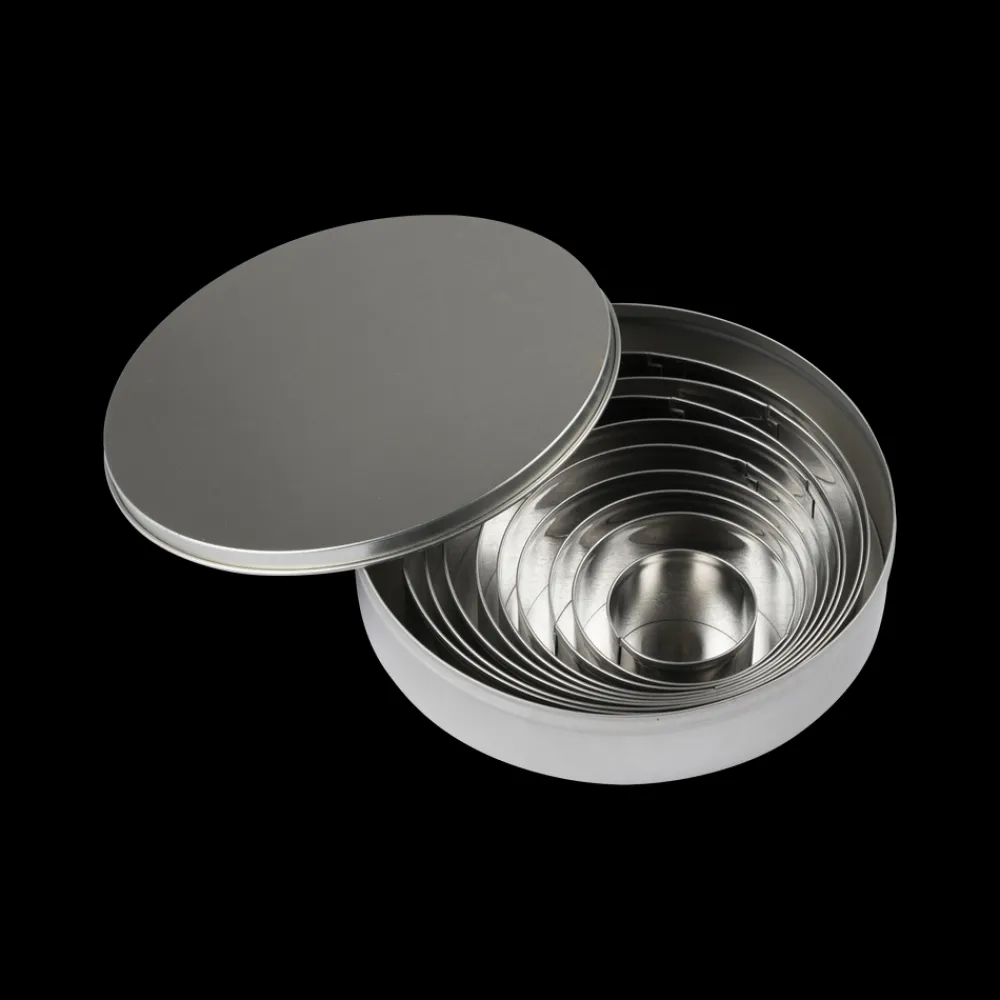 Udstikkersæt med 9 runde, glatte udstikkere i rustfrit stål, praktisk samlet i lækker metaldåse. Det perfekte sæt til at udstikke små bunde til kager og desserter, medaljebunde, marcipanskilte, småkager og lignende i forskellige størrelser.