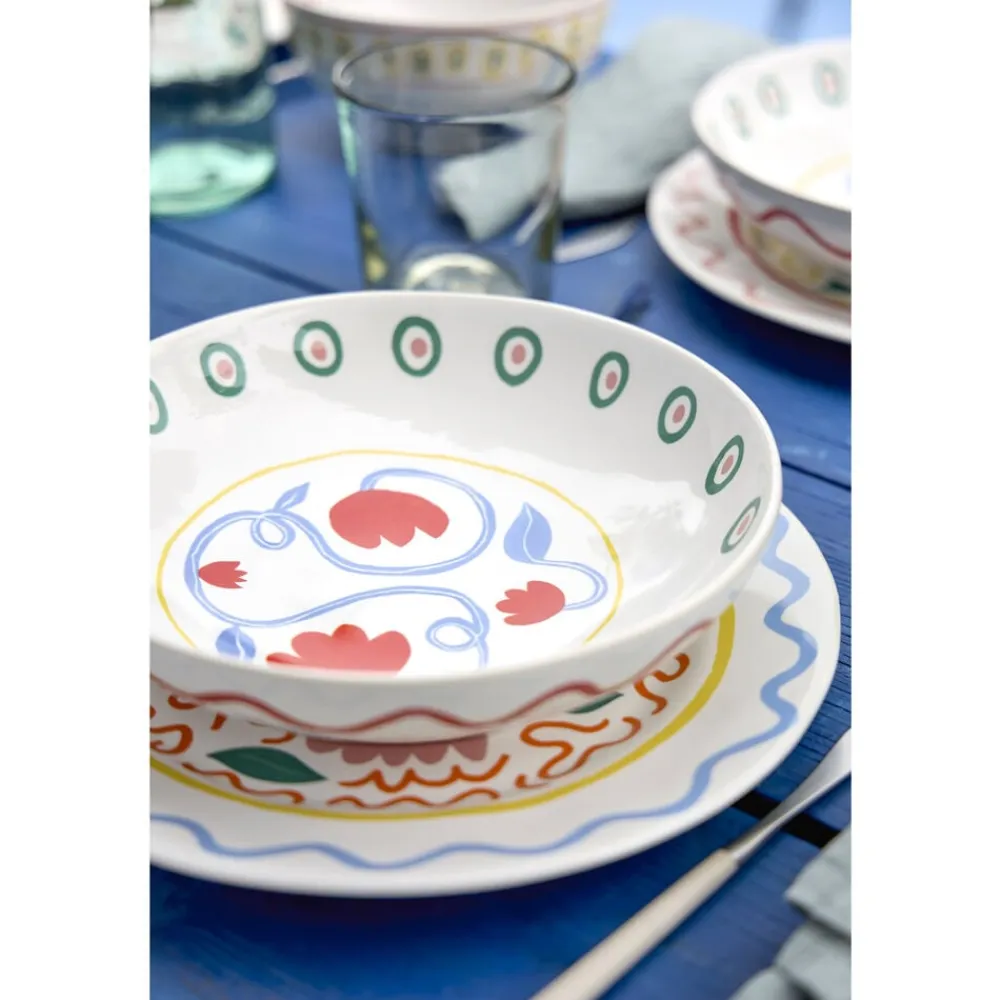 Salat-/pastatallerken, 23 cm. Den dybe tallerken bringer en følelse af sydlandsk lethed til bordet med sine røde blomster, der slynger sig yndefuldt om de lyseblå stængler. Perfekt til alt fra en cremet pastaret til en frisk salat. Brug den til måltider, der nydes langsomt og i godt selskab – præcis som ved et afslappet frokostbord i Sydeuropa.