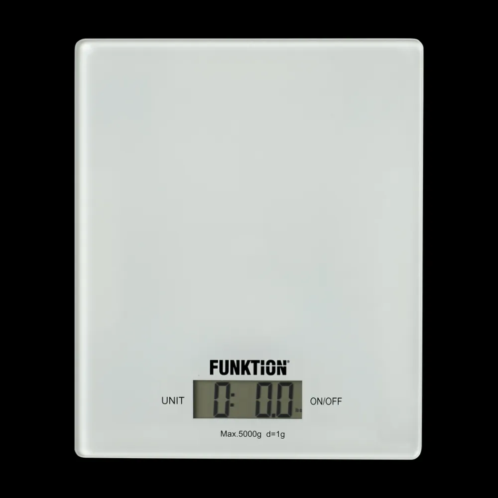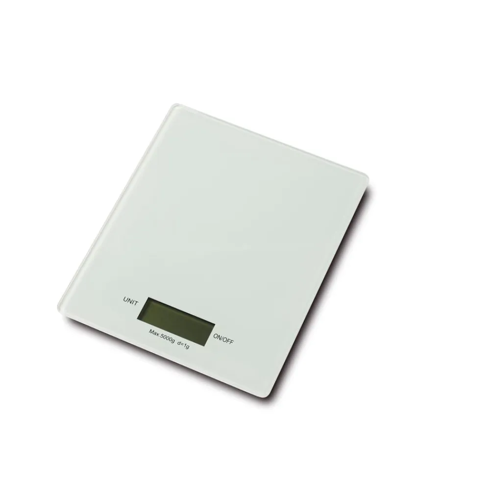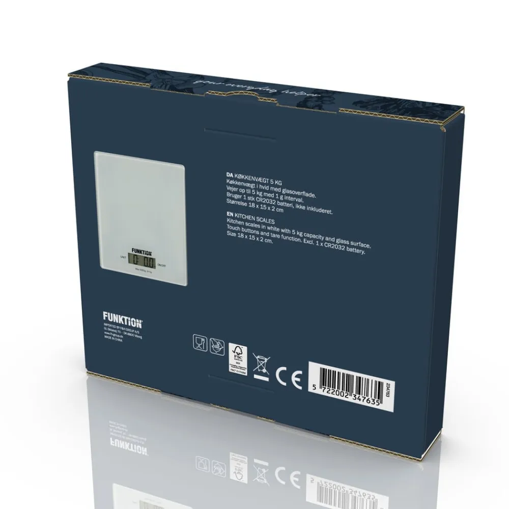 Køkkenvægt i hvid med 5 kg kapacitet og glasoverflade.