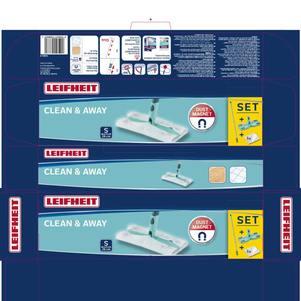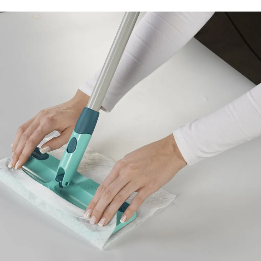 Clean & Away tørmoppesæt er ideelt til hurtig og nem rengøring af glatte gulve. Den flade bundplade med 360° roterende hængsel gør det let at komme rundt om bordben og andre møbler, så du kan fjerne støv og snavs uden besvær. 5 klude medfølger.