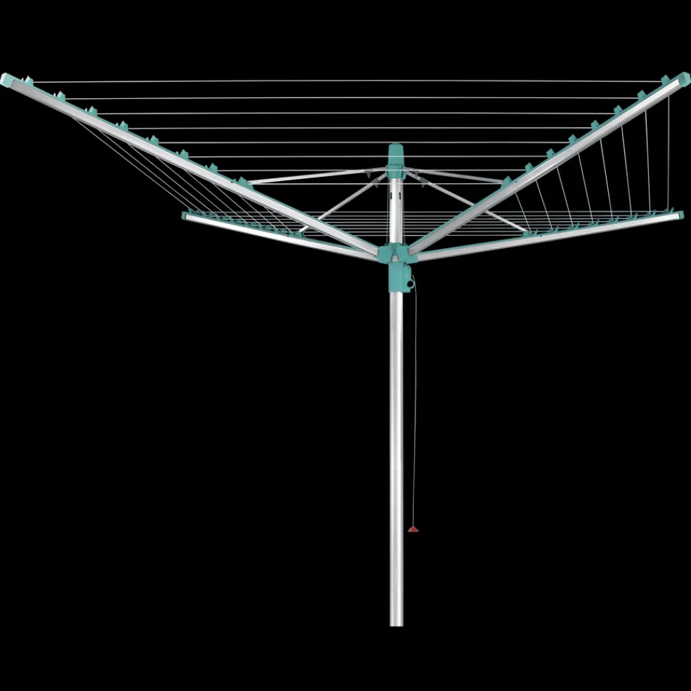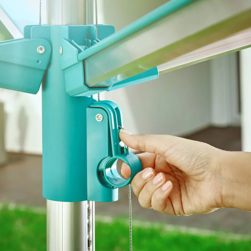 Paraplytørrestativ med 50 meters tørreplads. Easy-Lift system gør det nemt at slå stativet op ved blot et enkelt træk i en snor. UV-bestandige snore trækkes automatisk ind i stativet når det slås sammen, og derfor bliver de ikke beskidte og slidte.