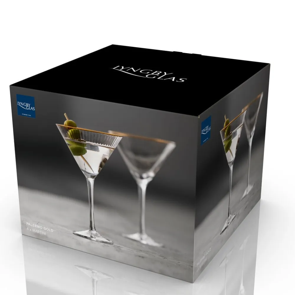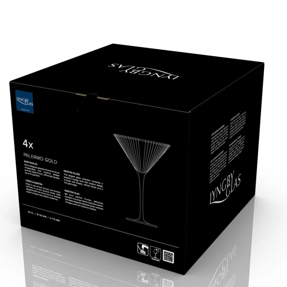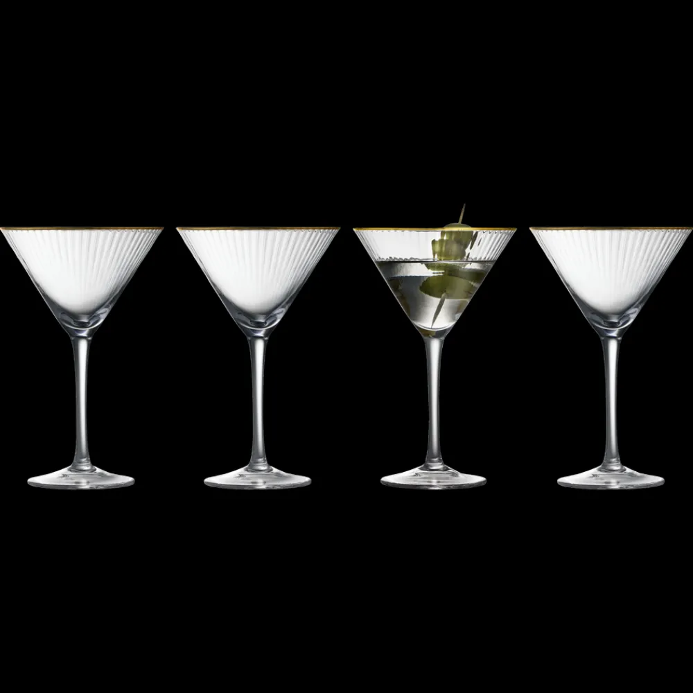 Smukt martiniglas med bløde, rundede former. Det elegante, riflede design med en fin guldkant giver glasset et flot vintagelook, der samtidig afspejler tidens trends. Brug det til serveringer af klassiske cocktails som espresso martini, cosmopolitan eller en dry martini – og lad de fine facetter reflektere lyset og glassets indhold på smukkeste vis. 25 cl. Sæt med 4 stk.