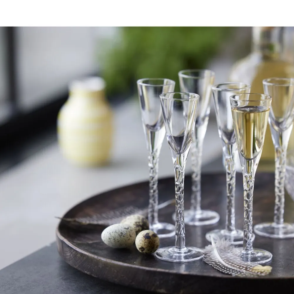 6 håndlavede og mundblæste snapseglas med hånddrejet snoet stilk bidrager til en god stemning ved bordet. Snapseglassene i klart glas har en flot, klassisk udformning og indeholder 2,5 cl. H 16 cm.