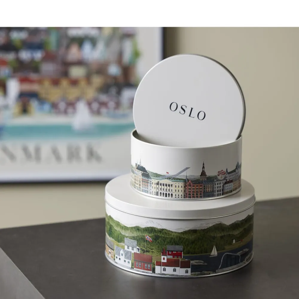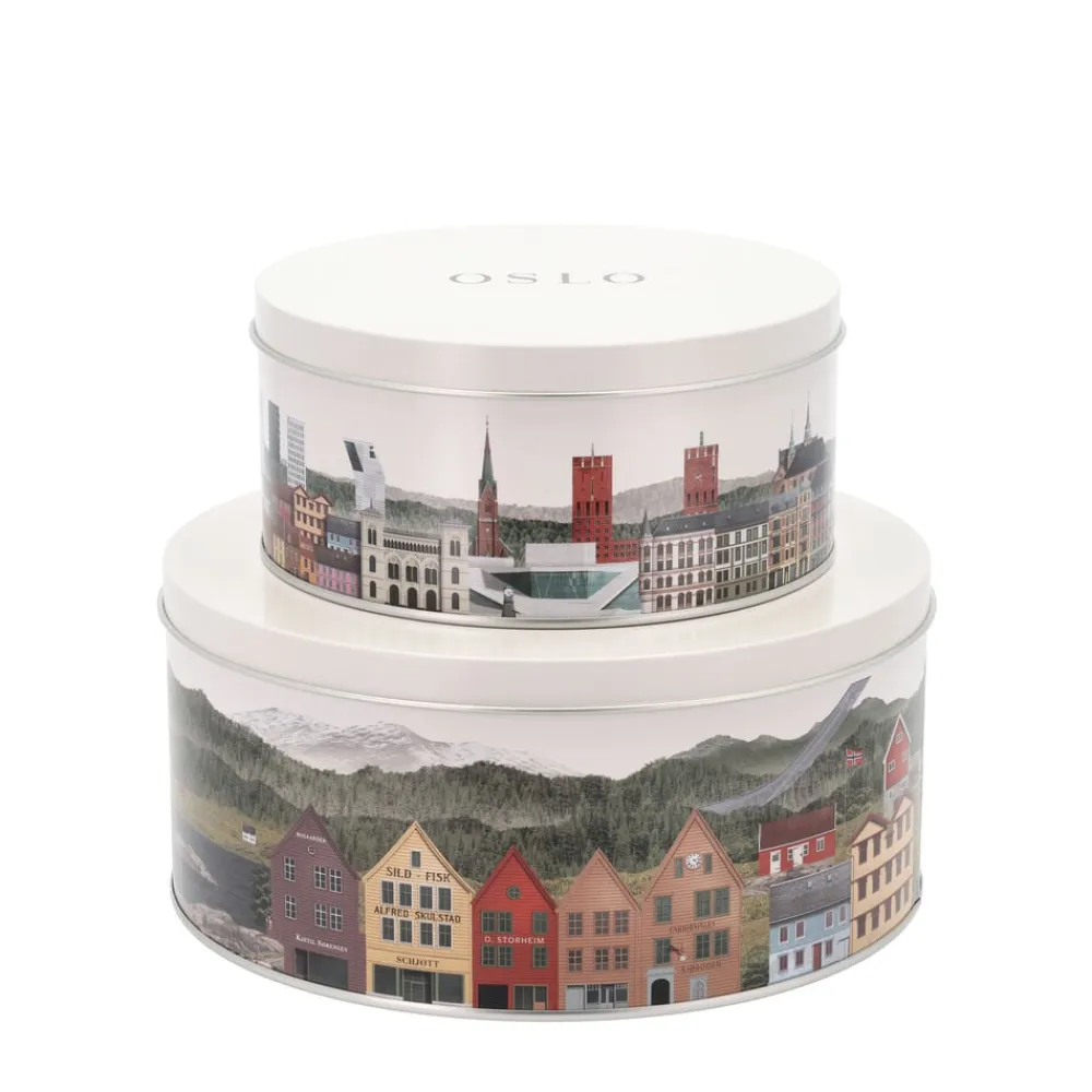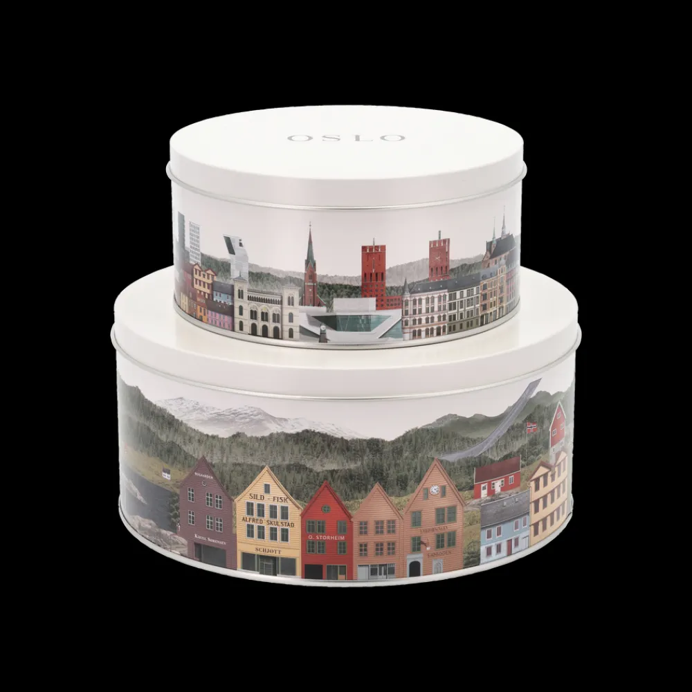 Martin Schwartz kagedåsesæt bestående af to runde dåser med norske motiver. Stor dåse med Norge-motiv, dia. 19,5 cm, højde 9 cm. Lille dåse med Oslo-motiv, dia. 14,6, højde 7 cm. Kagedåserne vaskes op i hånden.